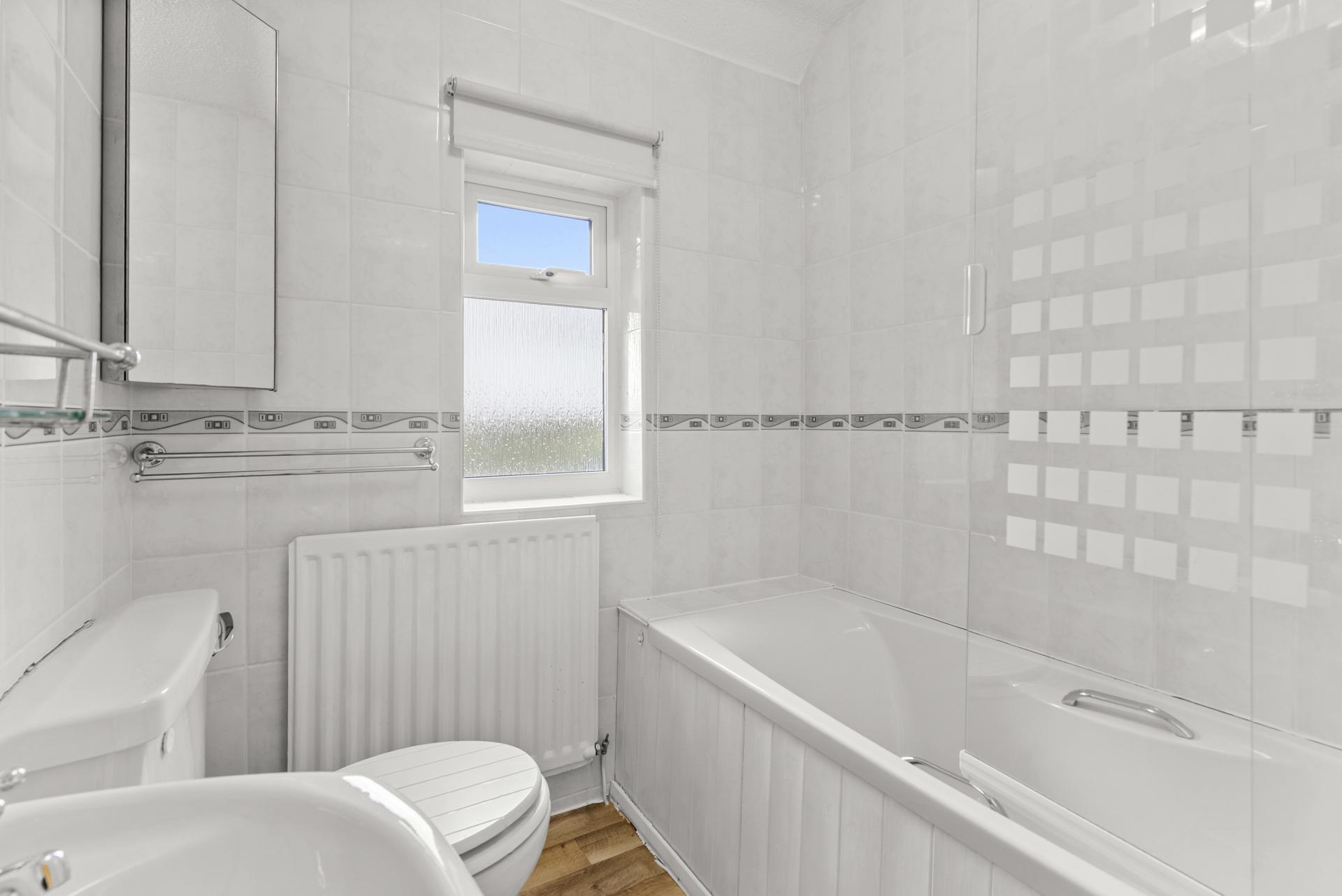 Obscure double glazed window to the rear aspect. Panelled bath with mixer/shower head tap, Triton electric shower with glass screen. Pedestal wash hand basin. Low flush w.c Fully tiled walls. Radiator. Tiled effect flooring.
