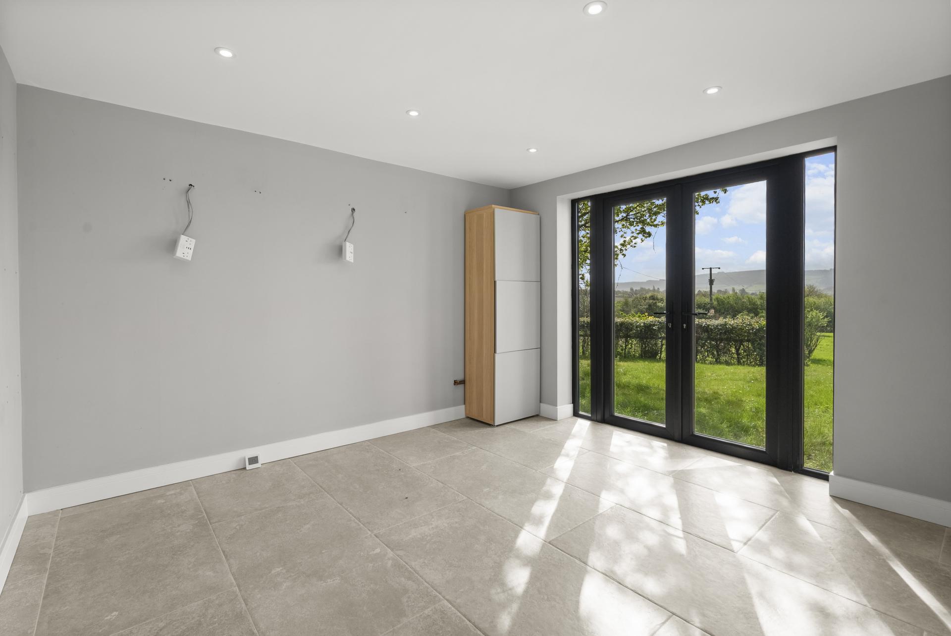 Double glazed French doors with side windows to the rear aspect. Fitted storage unit. Tiled floor. Down lights to the ceiling.