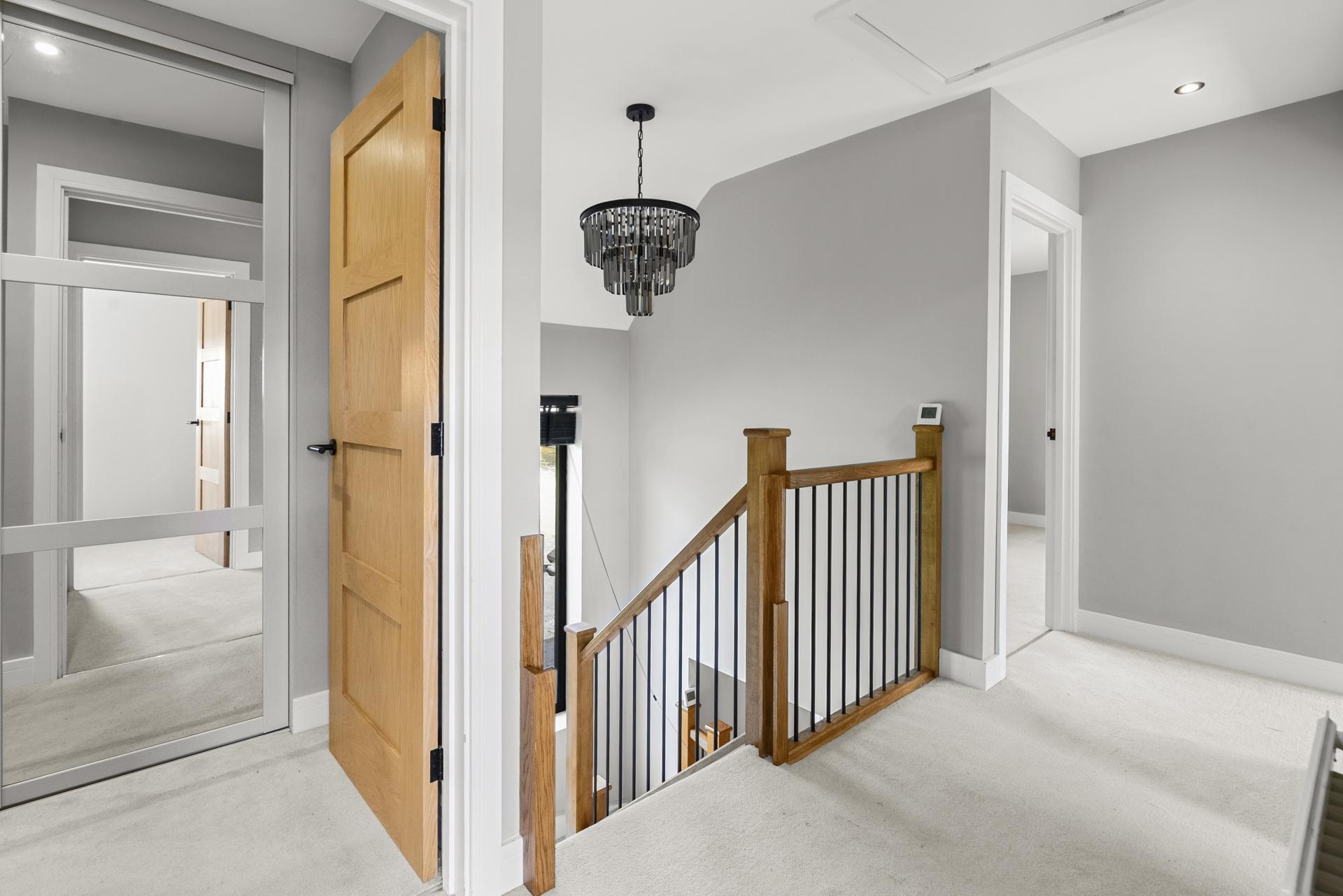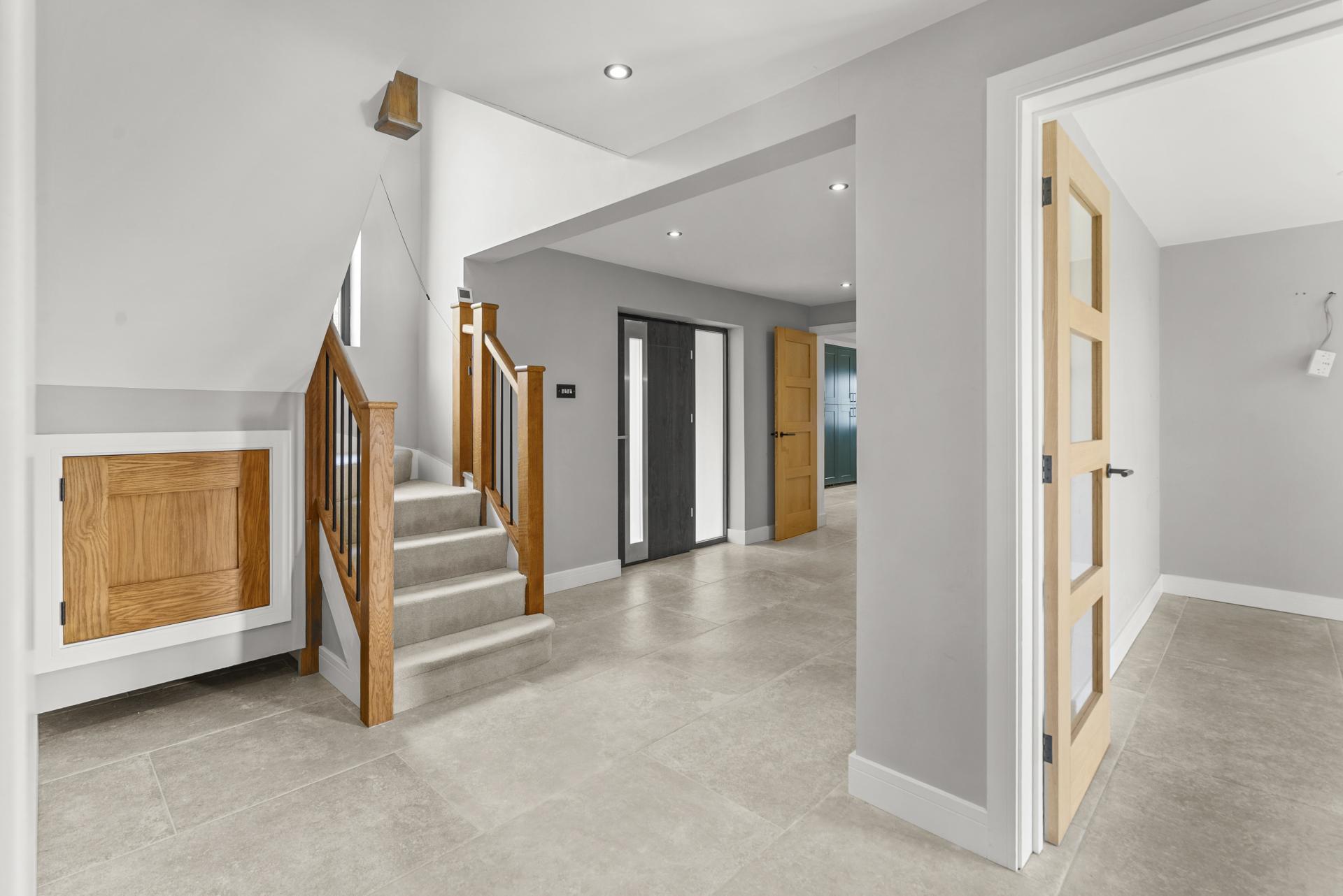 Obscure double glazed entrance door with side window. Feature wood panelling with wall lights. Double cloaks/storage cupboard (housing underfloor heating controls, fuse box etc.). Stairs rising to the first floor with storage area below. Ceramic tiled floor. Down lights to ceiling.