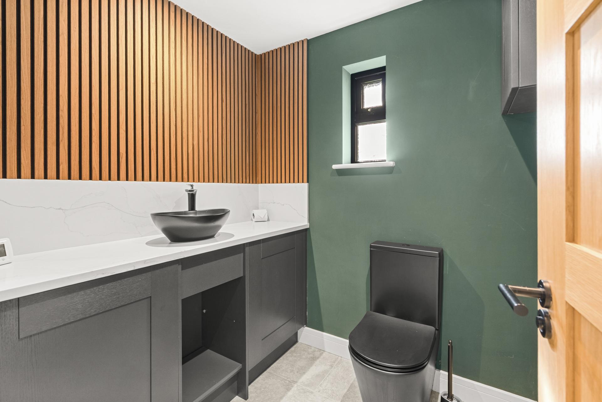 Obscure double glazed window to the rear aspect. Vanity unit with bowl sink and mixer tap. Low flush w.c. Tiled flooring. Down lights to the ceiling. Extractor fan.