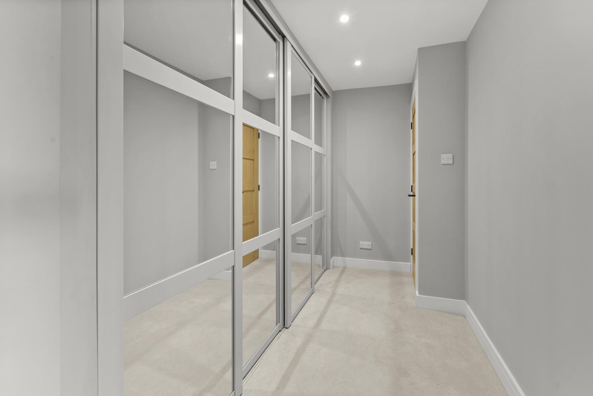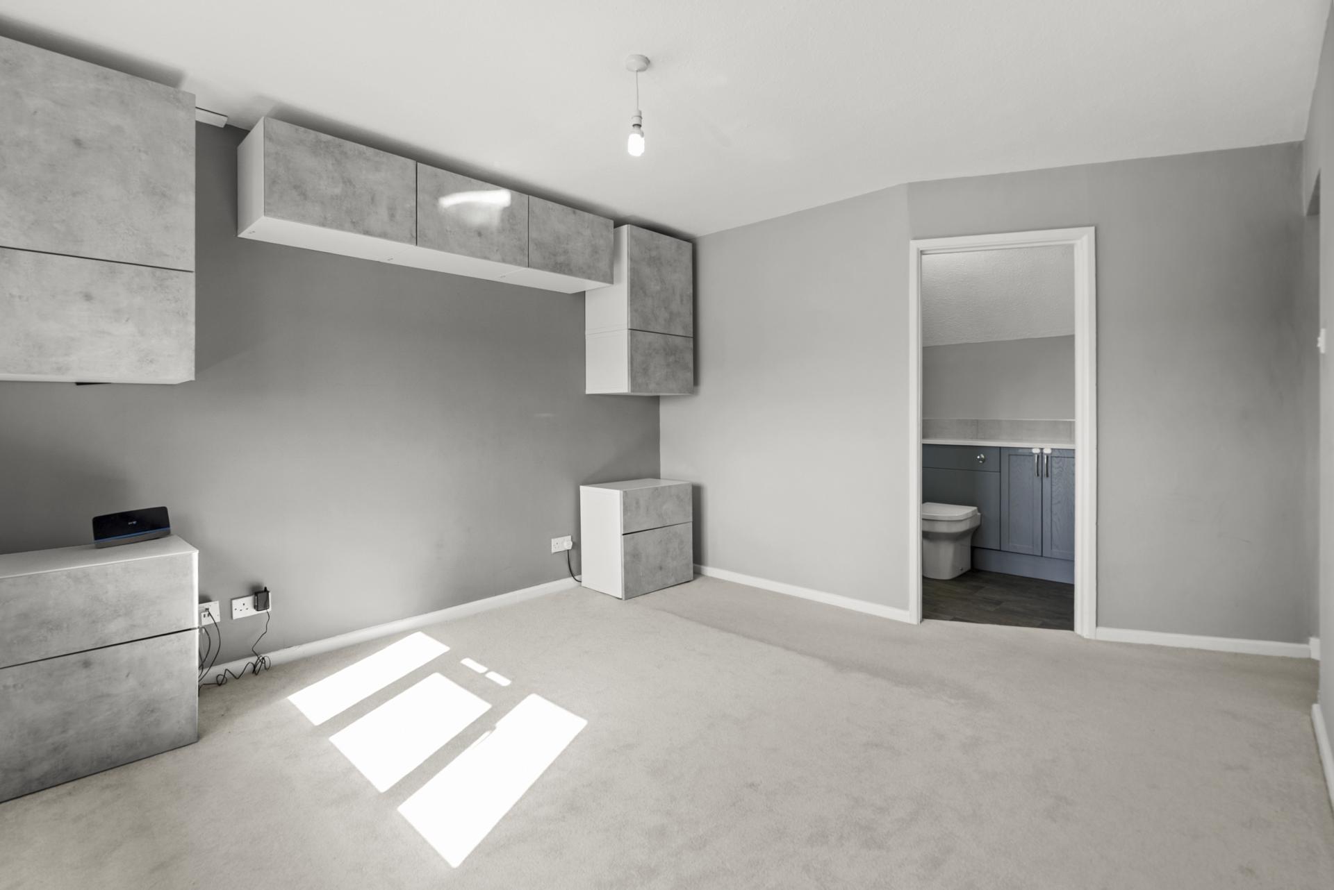 A dressing area (with extensive fitted wardrobes with hanging rails, shelves and drawers) leads into the bedroom with double glazed window to the rear aspect. Wall cupboards with matching bedside cabinets. Radiator.