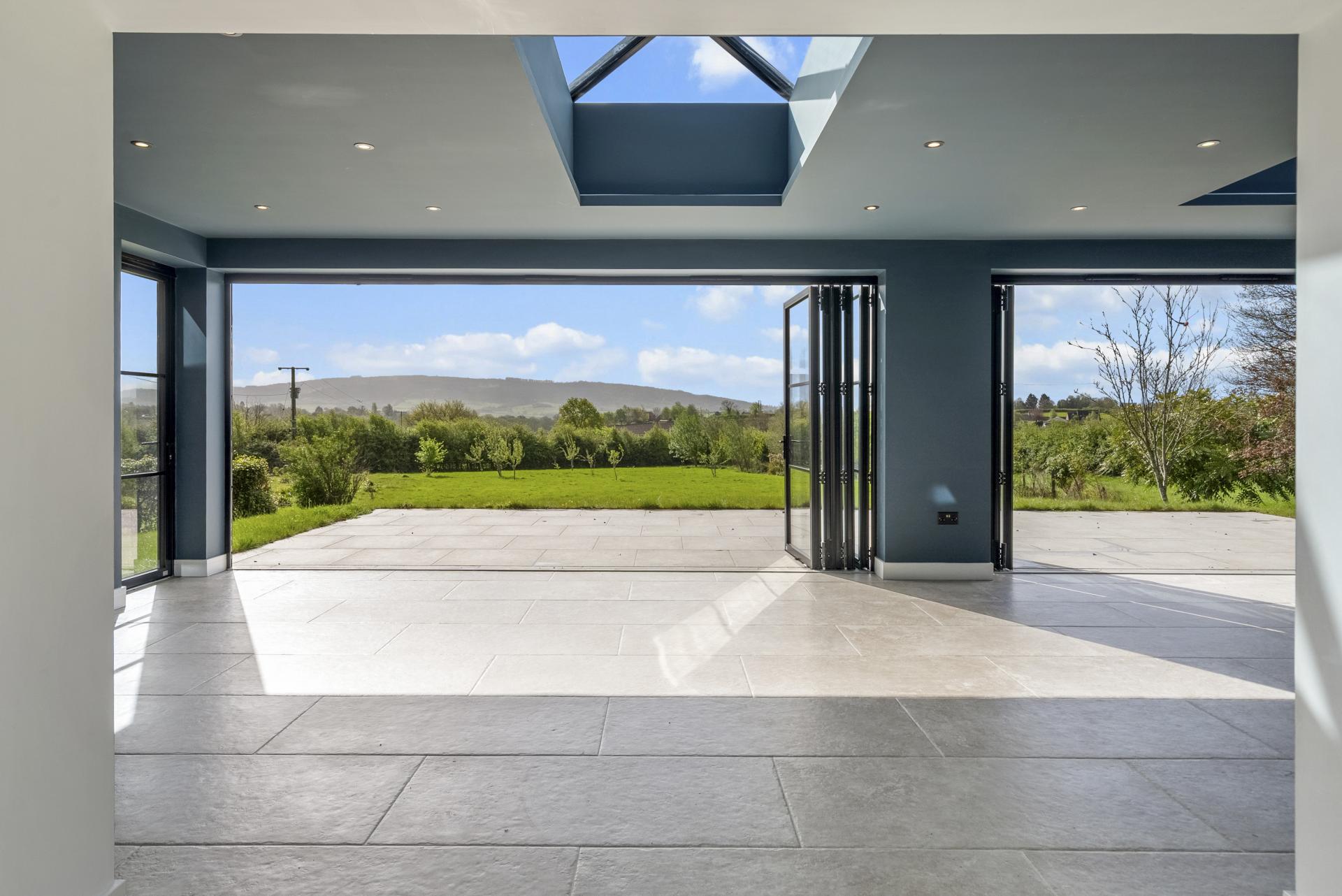 This room is the heart of this contemporary family home. Extended and full of natural light with picturesque views over surrounding countryside to Bredon Hill. The sitting area has two sets of double glazed bi-fold doors which open onto a patio seating area overlooking the South-Easterly facing garden. It has two lantern roof lights, ceramic tiled floor and down lights. The kitchen area is fitted with an extensive range of modern dark blue wall and base units surmounted by granite work surface with upstands. The central island also has extensive storage with fitted with cupboards and drawer units. One and a half bowl sink with mixer tap. Integrated appliances include: Twin 'eye level' oven/grill with warming drawer; NEFF induction hob with extractor; dishwasher and American style fridge freezer. Tiled floor. Down lights to ceiling.