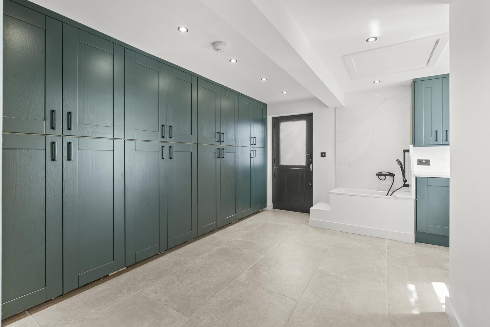 Obscure double glazed stable door to the side aspect and double glazed window to the rear. Fitted with an extensive range of units with sink unit (with mixer and filter taps) and pet washing sink/bath. Integrated washing machine and tumble dryer. Access into loft space. Tiled floor. Down lights to the ceiling.