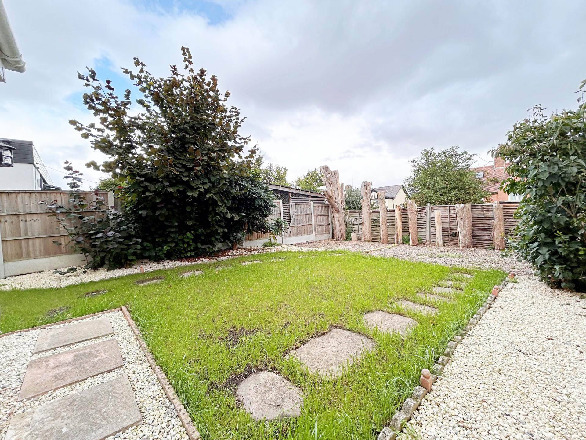 Low maintenance rear garden laid to lawn with mature trees and borders.