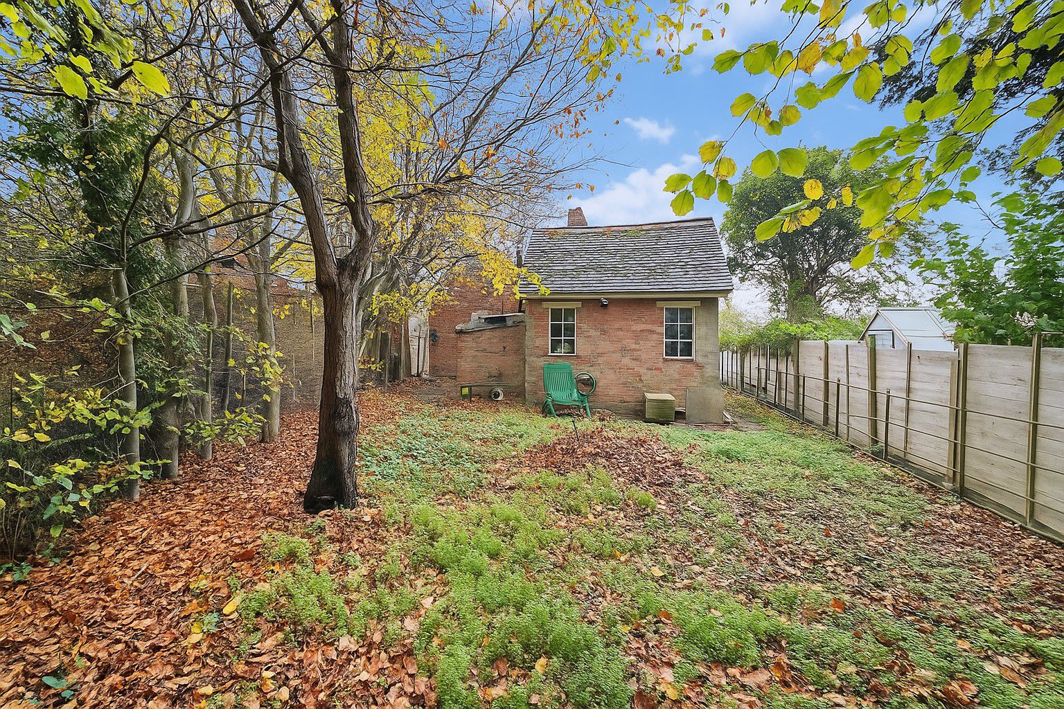 Gated access to the side. Laid to lawn; outside tap; mature planted trees; coal house.