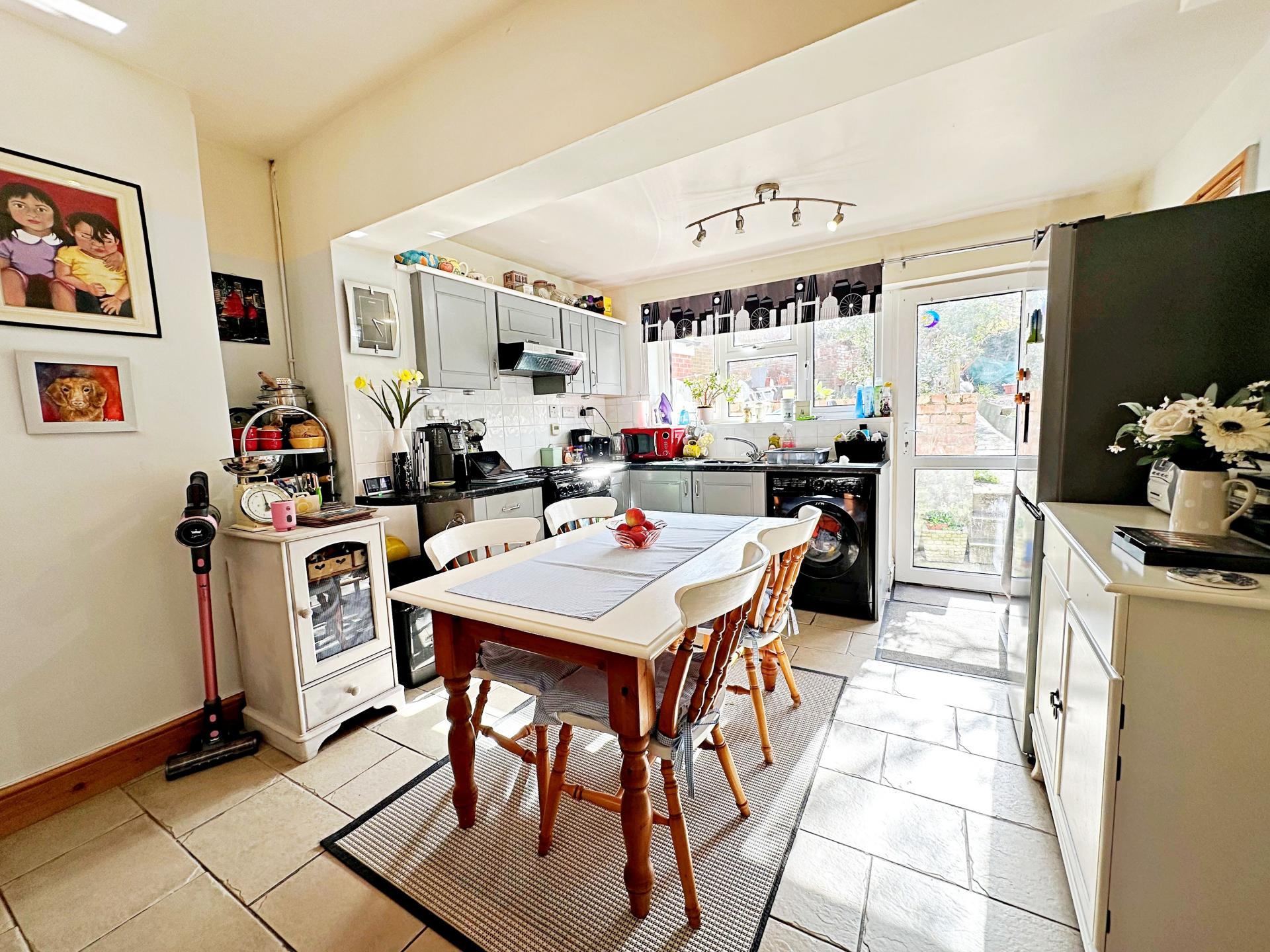 Double glazed window to the rear aspect and double glazed door into the garden. A range of wall and base units with worktop; stainless steel one and a half bowl sink with drainer and mixer tap. Space for a gas oven with extractor over, fridge/ freezer; space and plumbing for a washing machine. Pendant and down light fittings; radiator; tiled flooring. Stairs rising to the first floor; door to the bathroom.