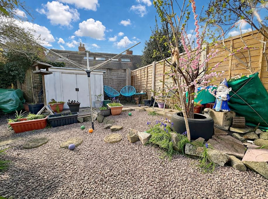 South- Westerly rear garden with patio seating areas; zoned areas with lawn and gravel; storage shed.