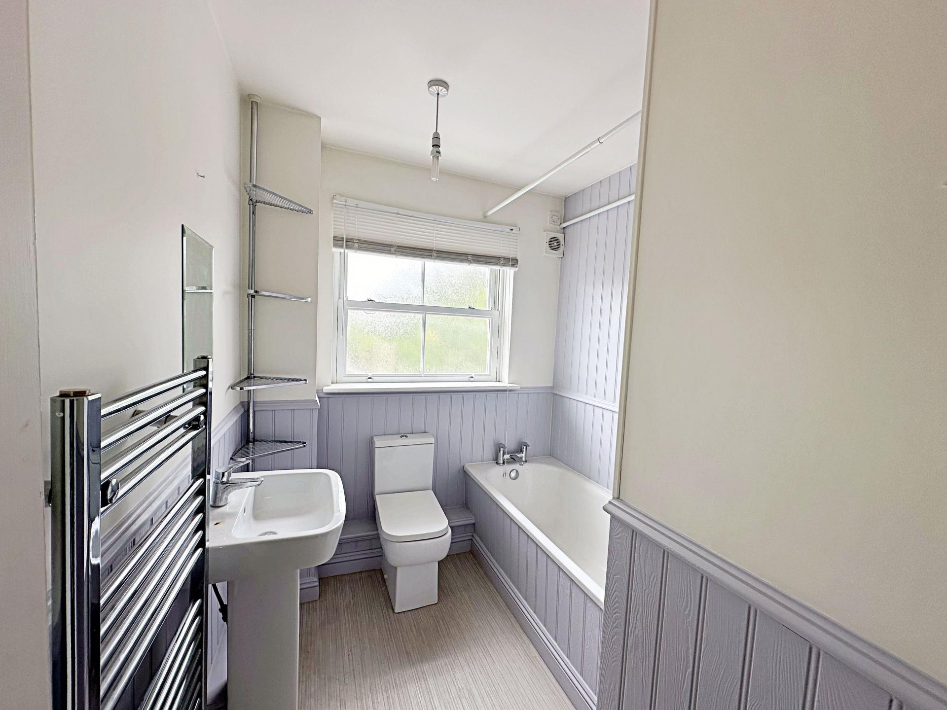 Obscure double glazed window to the rear aspect. Matching white suite: Panelled bath with mixer tap and mains fed shower. Pedestal wash hand basin. Low level w.c. Ladder/towel radiator. Wood effect wall panelling. Exactor fan.