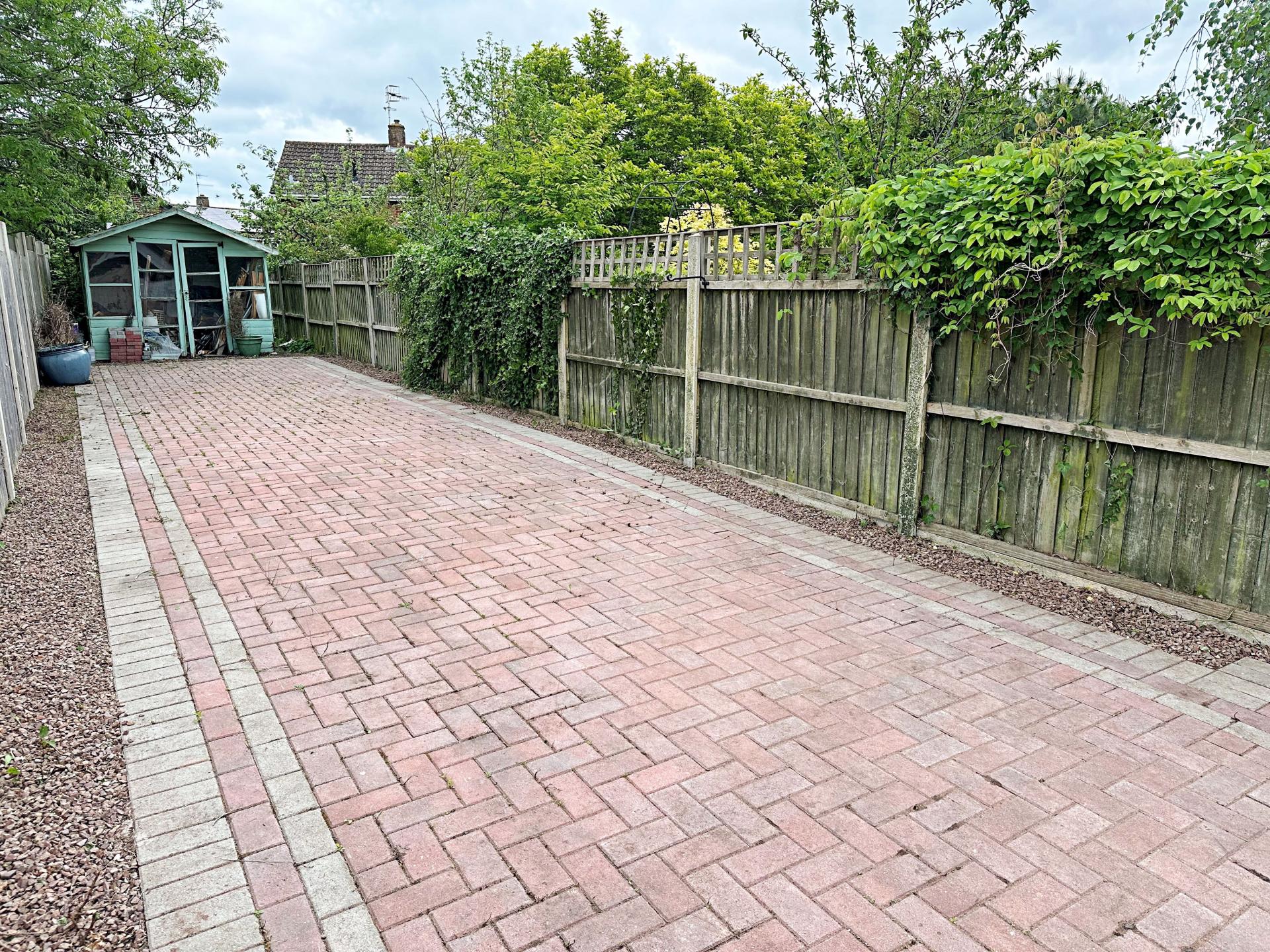 Enclosed by fencing. Small block paved patio area directly outside kitchen with steps leading up to the main garden which is also block paved/low maintenance. Raised planter bed. Greenhouse.