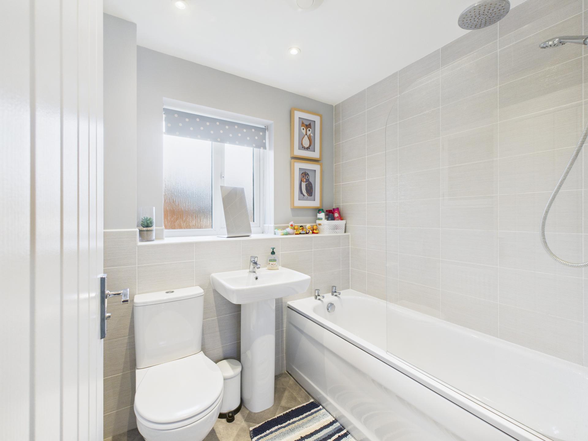 Obscure double glazed window to the rear aspect. Panelled bath with mains fed mixer shower over, including a rainfall and hose attachment. Pedestal hand wash basin with mixer tap; low level w.c. Part tiled walls. Down lights; extractor fan and radiator.