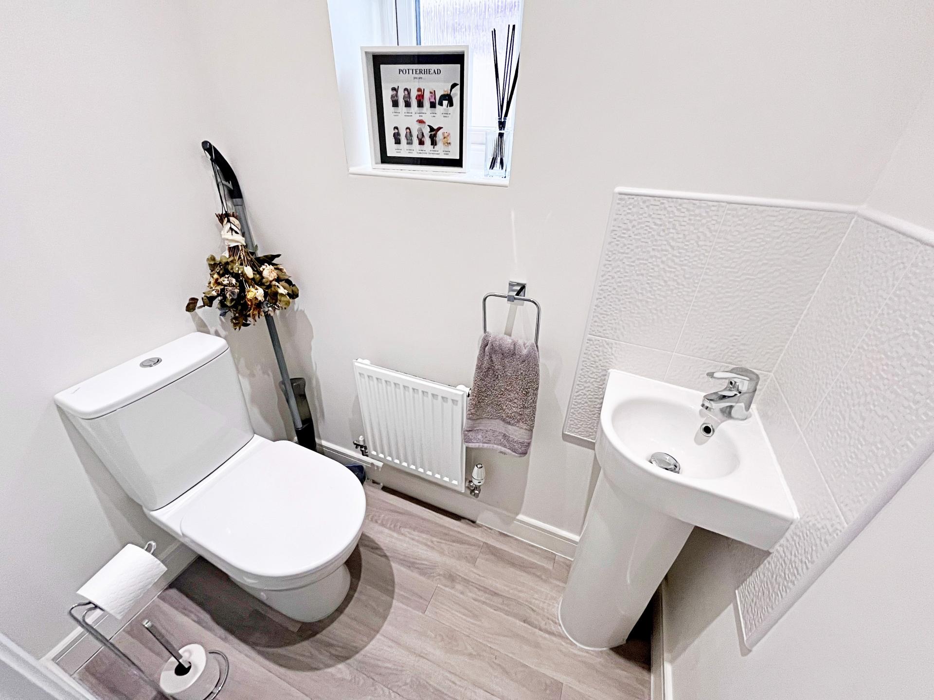 Obscure double glazed window to the side aspect. Pedestal wash hand basin with tiled splash back. Low level w.c. Wood effect floor. Extractor. Down lights. Radiator.