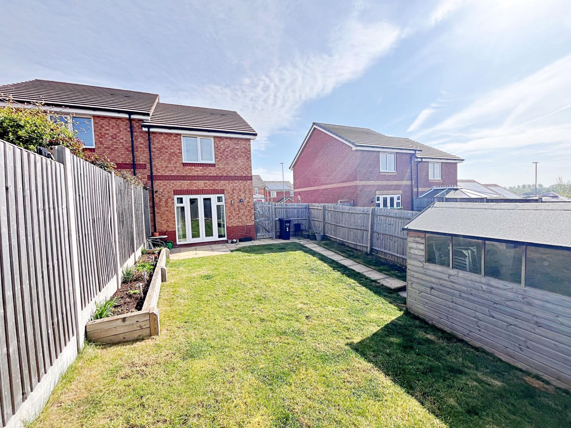 Fenced garden laid to lawn with patio seating area. Garden shed. Outside watering tap. Gated access to the side leading to the front.