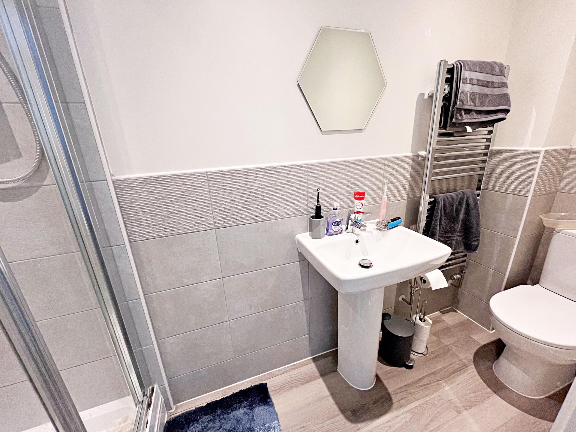 Walk-in shower cubicle with tiled walls and glass door. Pedestal hand wash basin with tiled splash back. Low level w.c. Wood effect flooring. Heated towel rail. Down lights. Extractor fan.