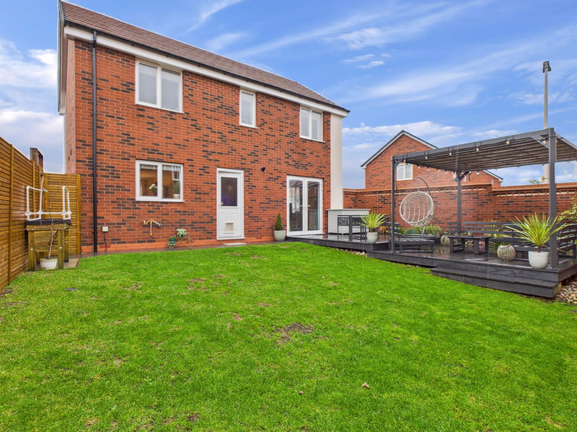 Part walled garden which is laid to lawn with raised wooden decking seating area. Hard landscaped area for a storage shed. Path to the side gate leading to the driveway and garage.