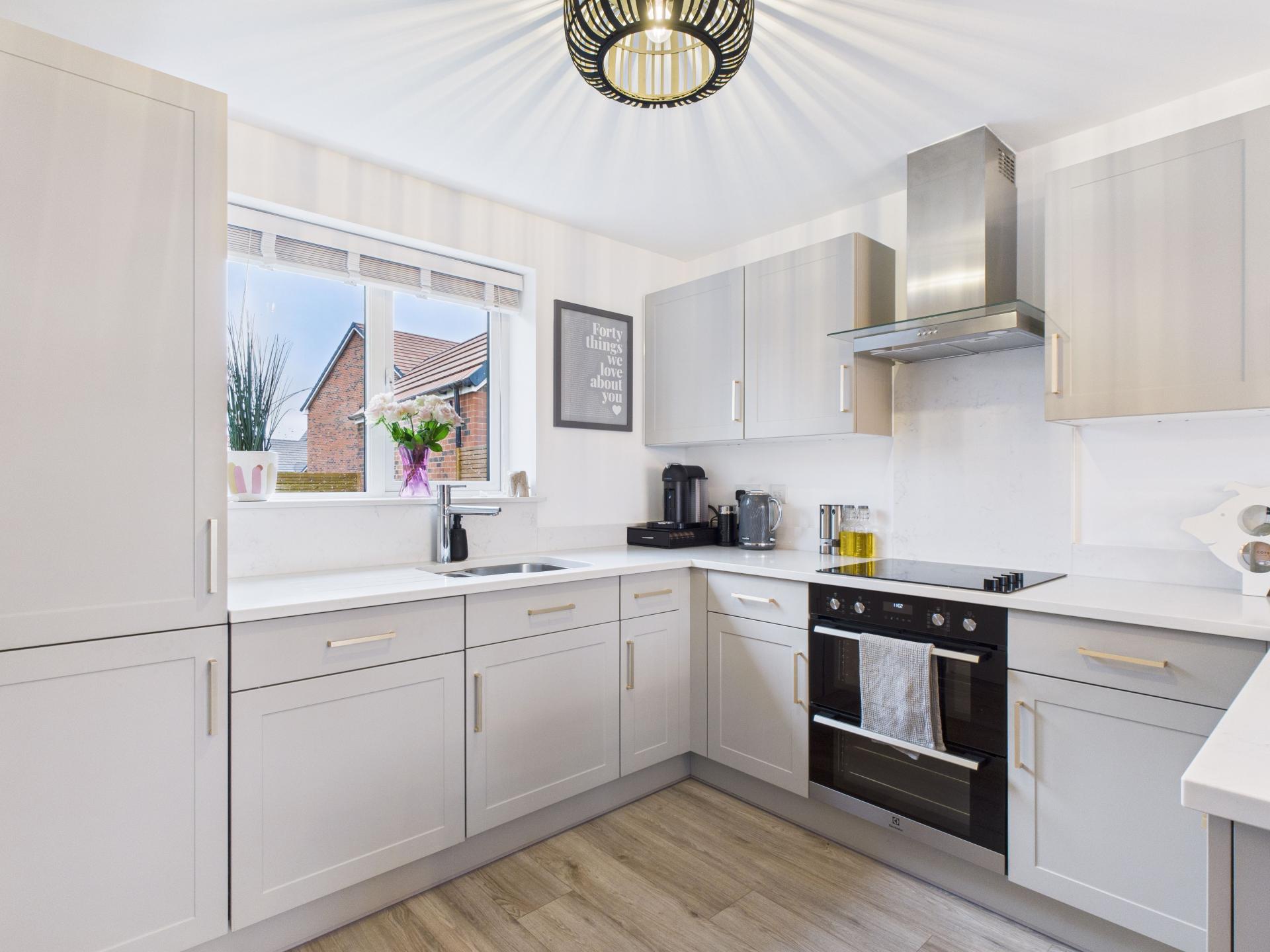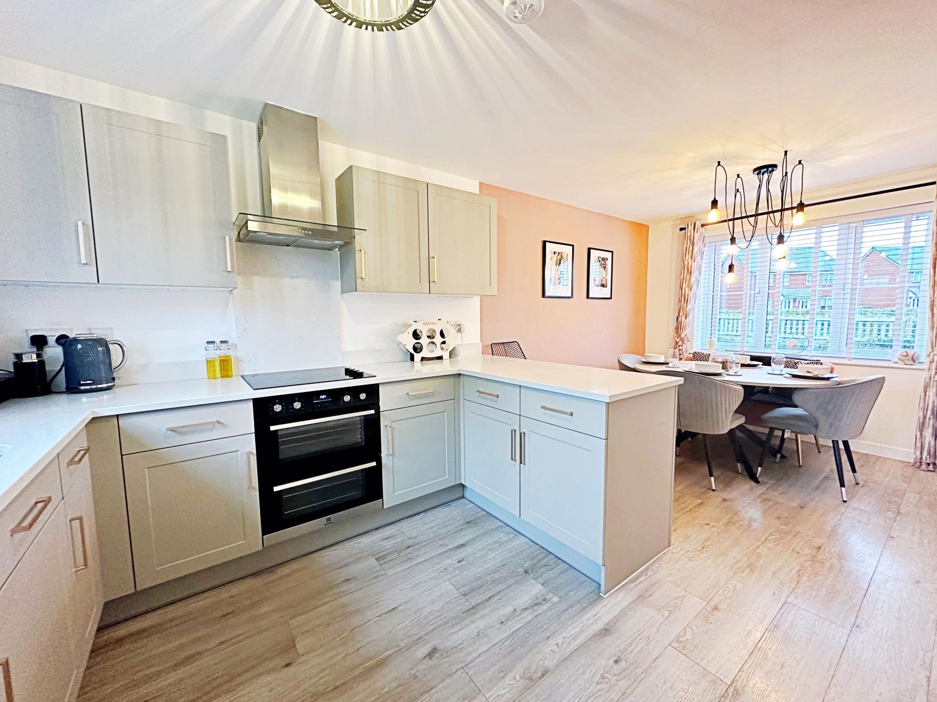 Double glazed windows with internal blinds to the front and rear aspects. Range of wall and base units surmounted with quartz work surface and breakfast bar. Stainless steel one and a half sink with mixer tap. Integrated electric oven, induction hob and extractor fan above. Integrated 'Zanussi' dishwasher and fridge/ freezer. Pendant light fitting. Radiator; Doors into the utility room and storage cupboard.
