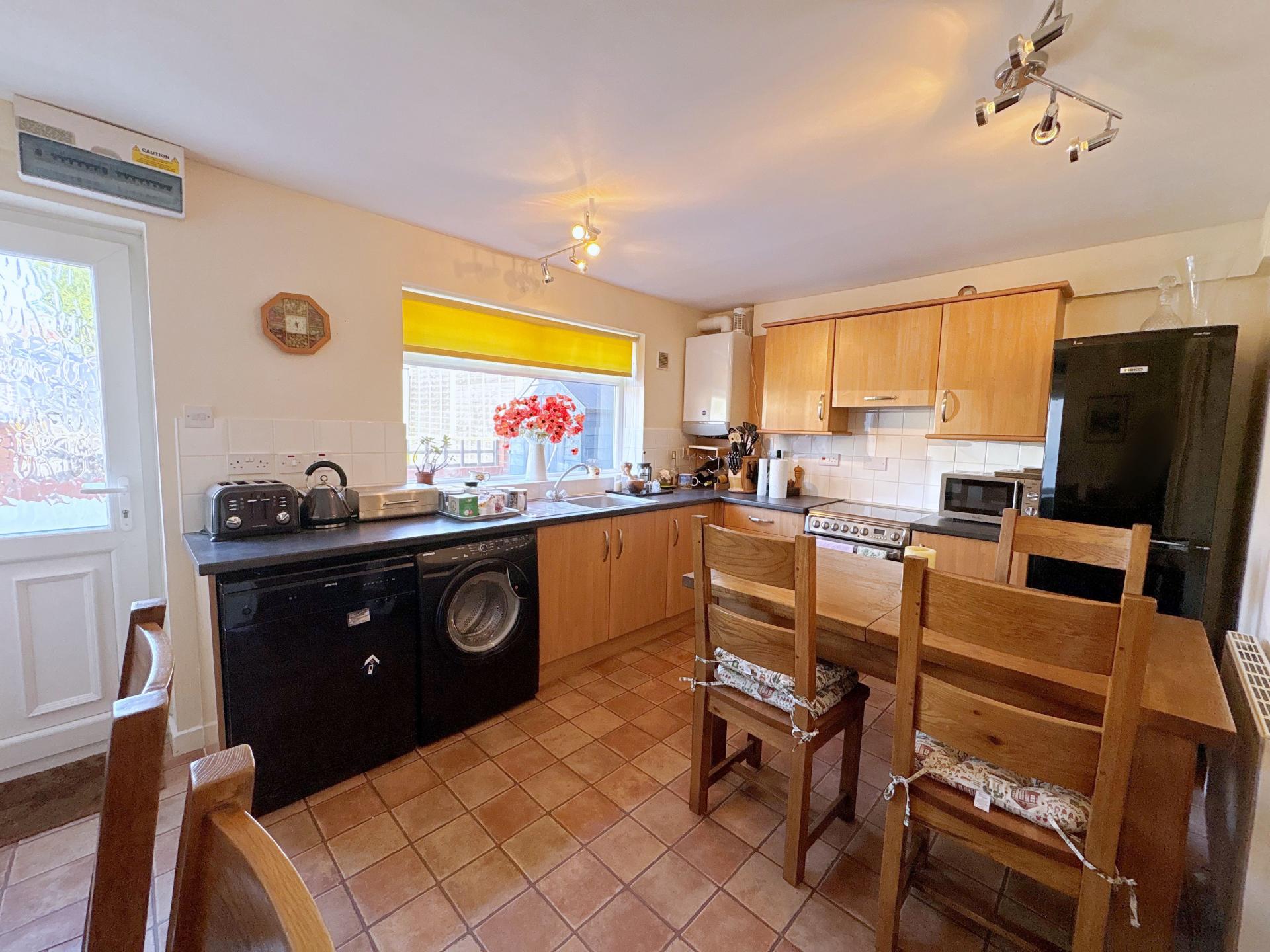 Double glazed window to the rear aspect. Obscure double glazed composite door to the rear. Range of wall and base units with work top and built in extractor fan. Stainless steel sink and drainer with mixer tap. Breakfast bar. Space and plumbing for an electric oven, fridge/ freezer, dishwasher and washing machine. Gas fired 'Baxi Duo-Tec' boiler. Pendant light fitting. Radiator.