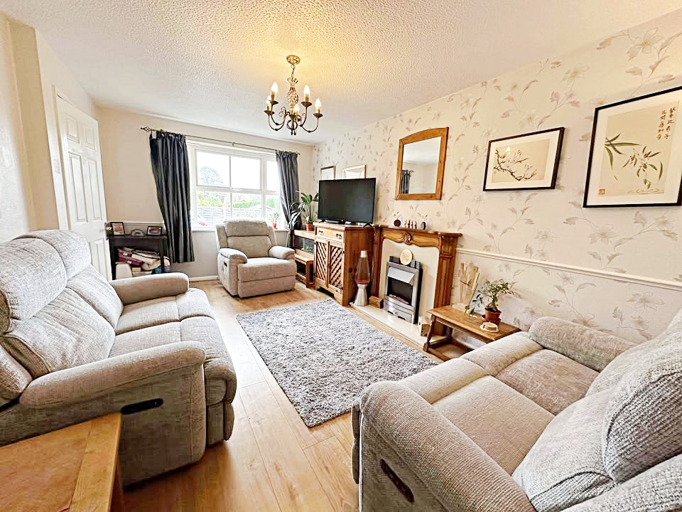 Double glazed window to the front aspect. The focal point of the lounge is the wooden fireplace with electric fire. Half height dado rail. Radiator. Laminate wood floorings. Doors into kitchen and entrance hall.