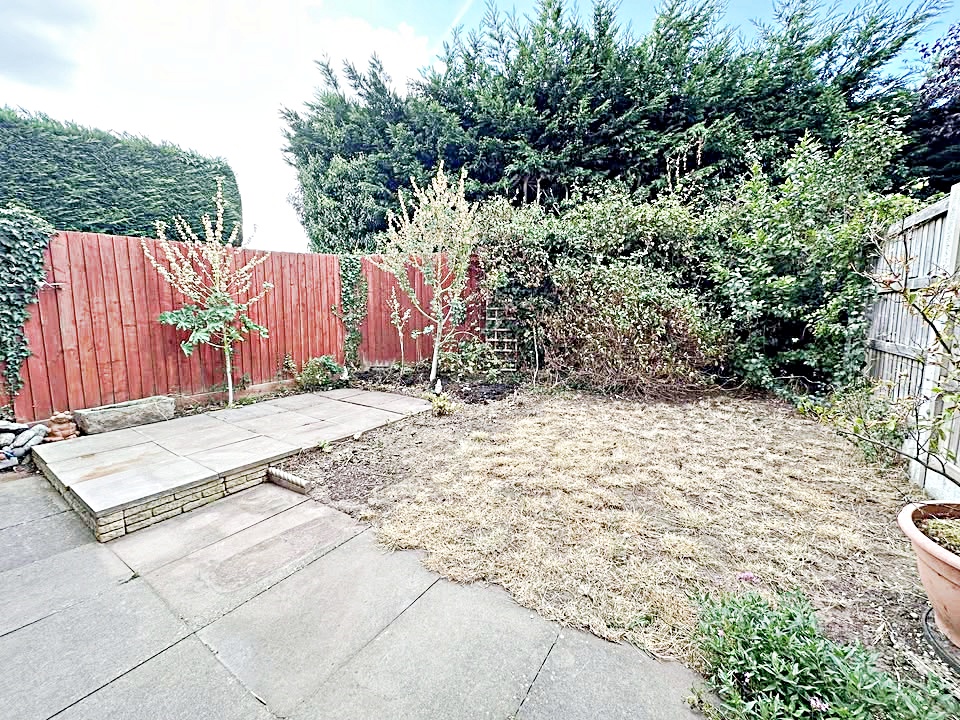 Enclosed with gated side access. Patio seating area with lawn and mature planting. Wooden shed with undercover storage; gated access to the front.