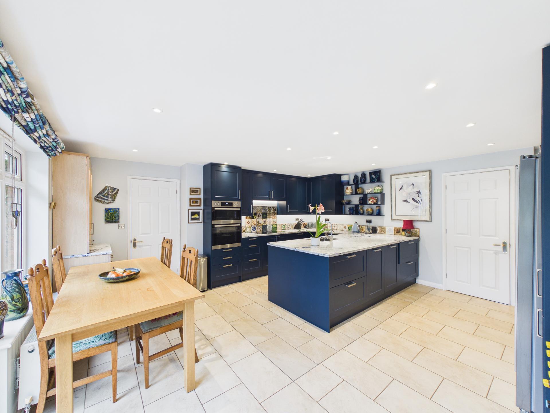 Double glazed windows tot he rear aspect with French doors leading to the garden. Down lighting with integrated LED strip lights. A range of wall and base units surmounted with marbled effect worktop; tiled splash back; one and a half steel sink with single lever mixer tap. Integrated 'AEG' electric grill and fan oven; 'AEG' venting induction hob. Integrated 'Bosch' dishwasher; integrated units with space for a fridge/freezer. Tiled flooring; doors leading to the garden room; utility room and entrance hall.