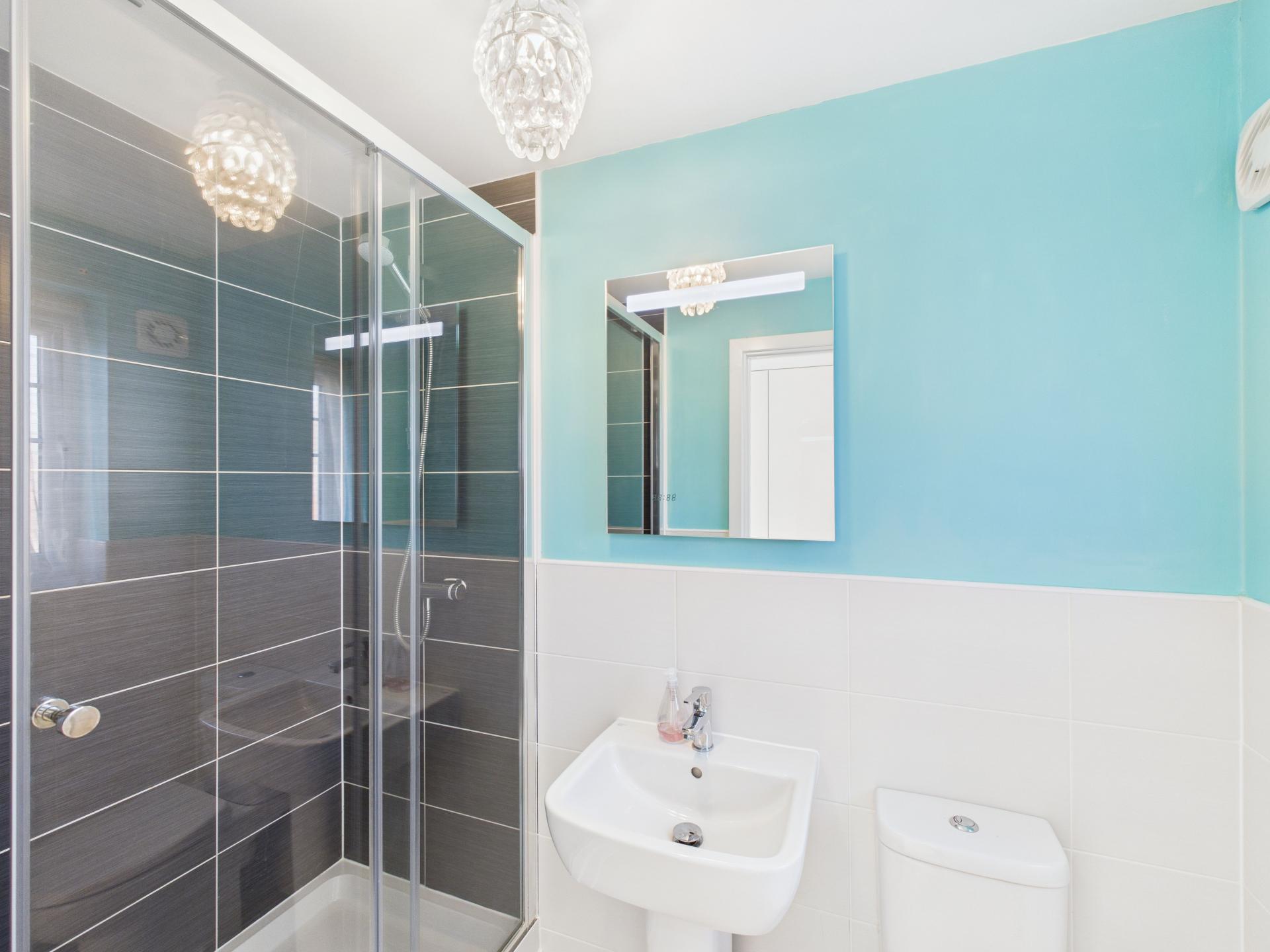 Obscure double glazed window. Shower cubicle with mains fed shower. Tiled splashbacks. Pedestal wash hand basin and low flush w.c. Central heated ladder rail.