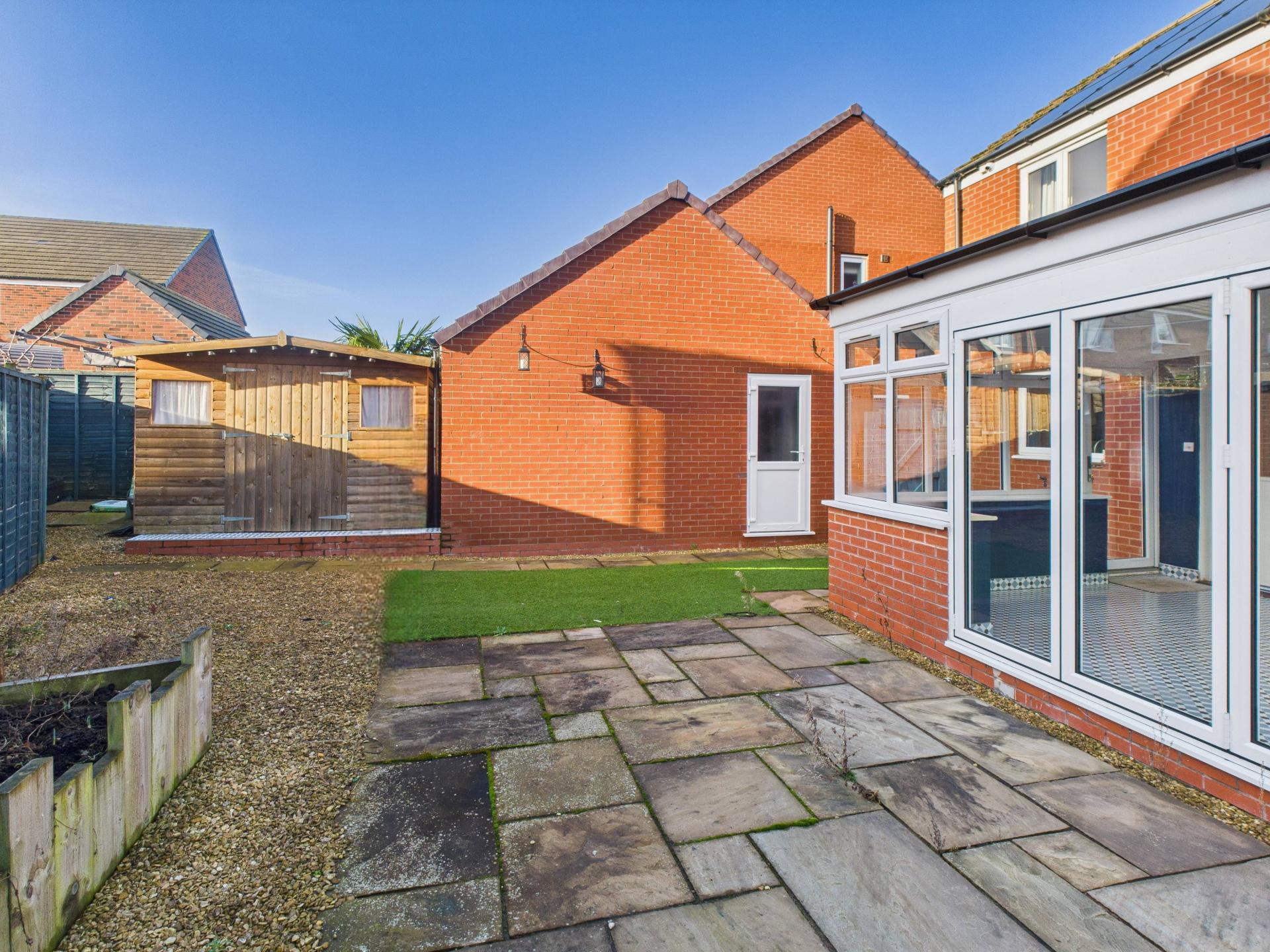 Low maintenance South facing with artificial lawn and a patio seating area. Garden shed.