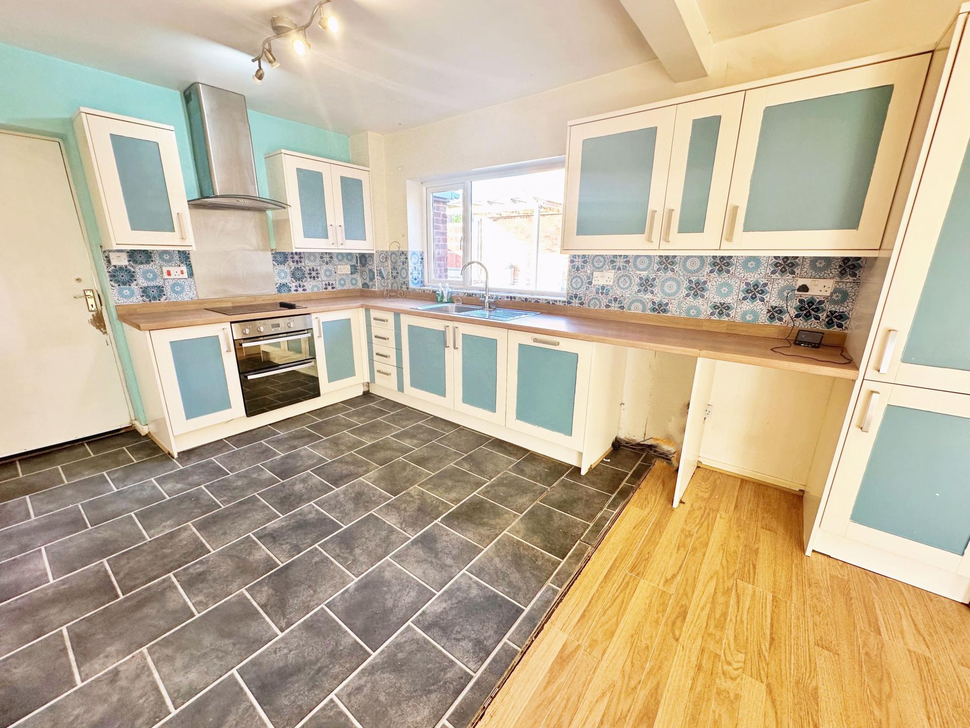 Double glazed window to the rear aspect. Range of wall and base units; integrated oven with electric hob and overhead extractor; stainless steel splash back; integrated dishwasher; space for fridge/freezer. Wooden worktop; stainless steel sink with mixer tap; part tiled walls; radiator; part wooden and part tile effect flooring; pendant light fittings. Doors to reception room and garage.