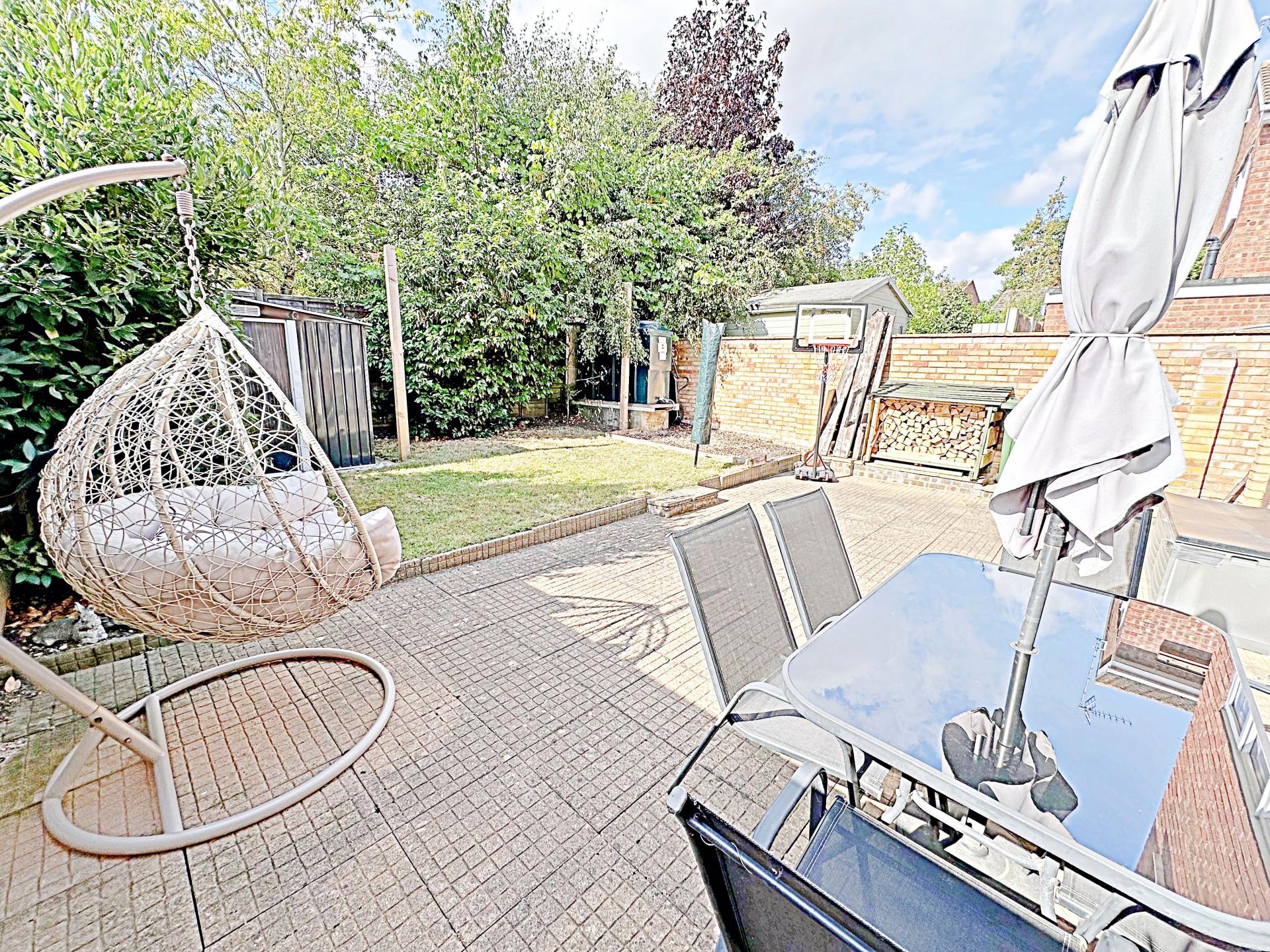 Enclosed by fencing with gated side access. Patio seating area with lawn and mature planted border. Storage shed. Log store. Oil tank.
