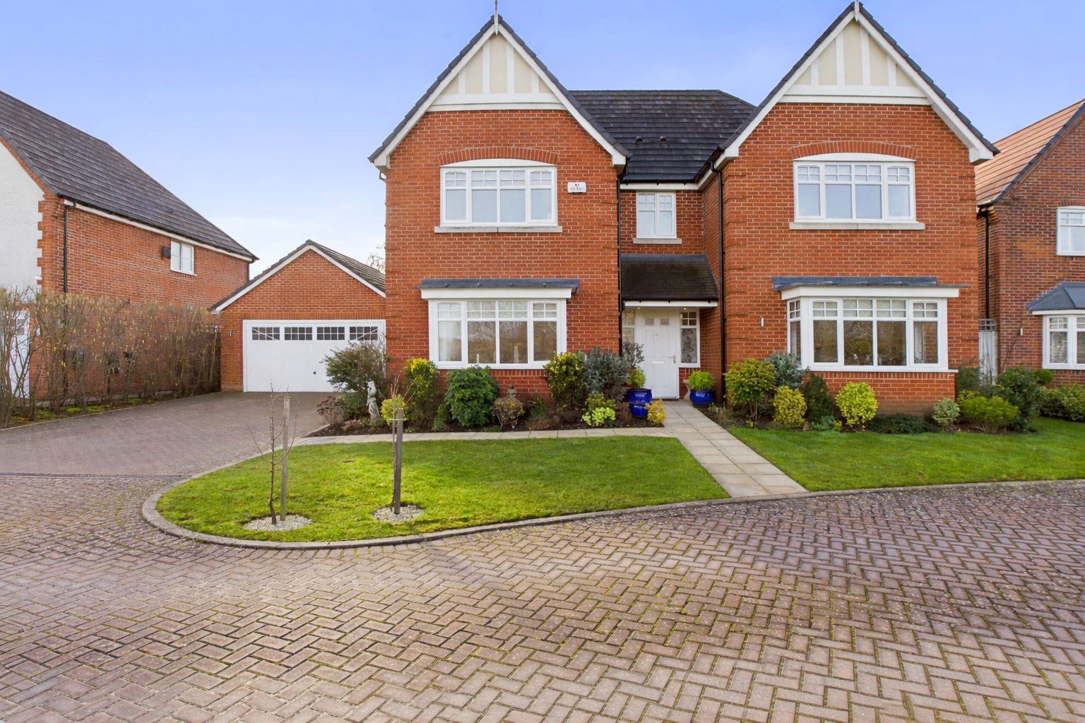 Block paved driveway for multiple vehicles leading to the double garage with an up and over electric door. Path to the front with a storm porch; laid to lawn with mature planted borders; gated access to the rear garden.