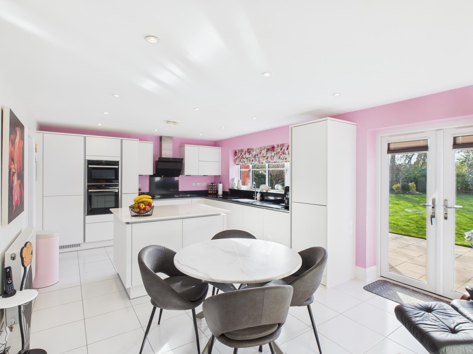 Triple glazed window and French doors to the rear aspect. A range of wall and base units surmounted with Silestone worktop and upstand; integrated sink with mixer tap. Integrated 'NEFF' electric induction hob and extractor fan over, 'NEFF' double oven/microwave and larder fridge. Island with storage cupboards surmounted with worktop. Down lights; radiator; tiled flooring and door to the utility room.