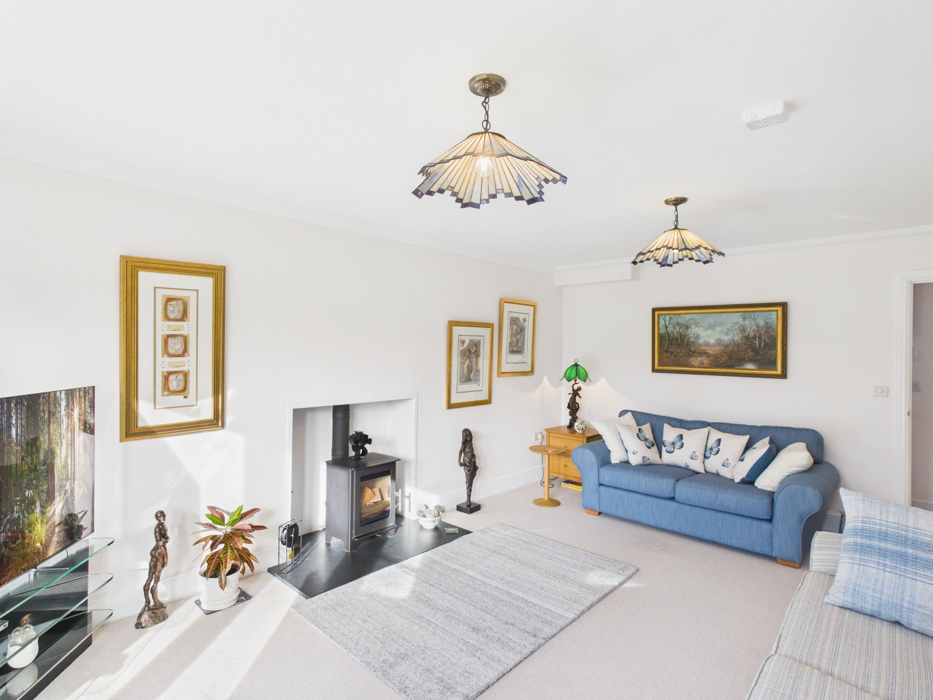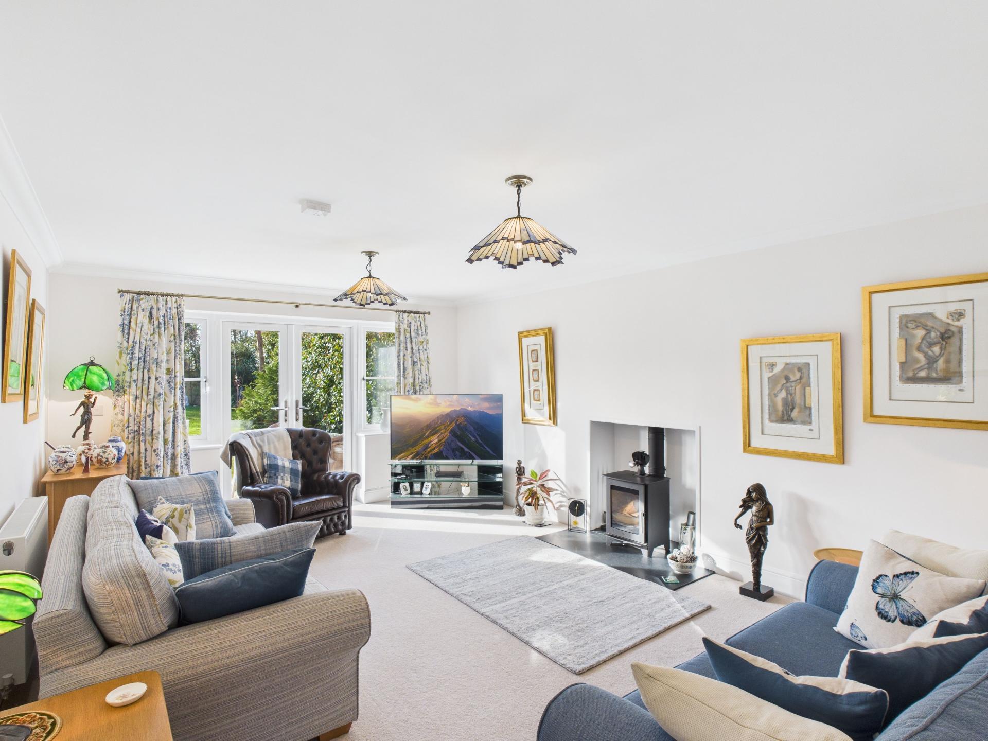 Triple glazed French doors with side glazing to the South facing rear garden. Log burner with granite hearth; pendant light fitting; radiator. Currently being used as the lounge.