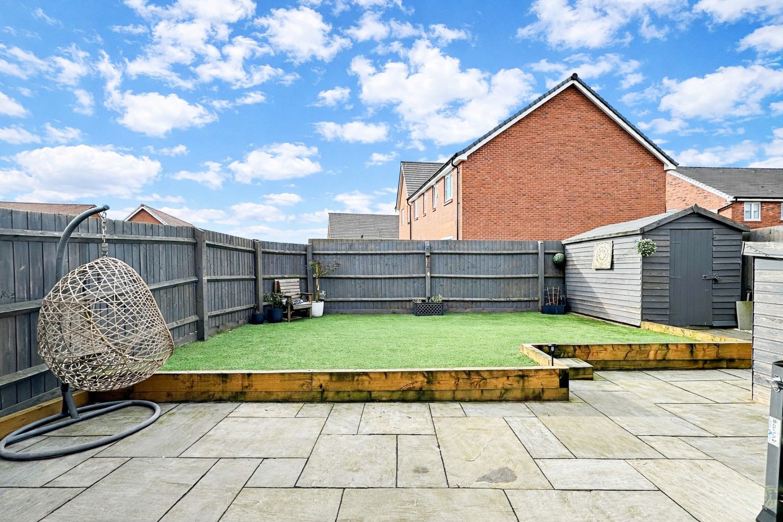 Patio seating area with step up to the AstroTurf laid lawn; path to the timber shed and gated access to the driveway; outside watering tap.