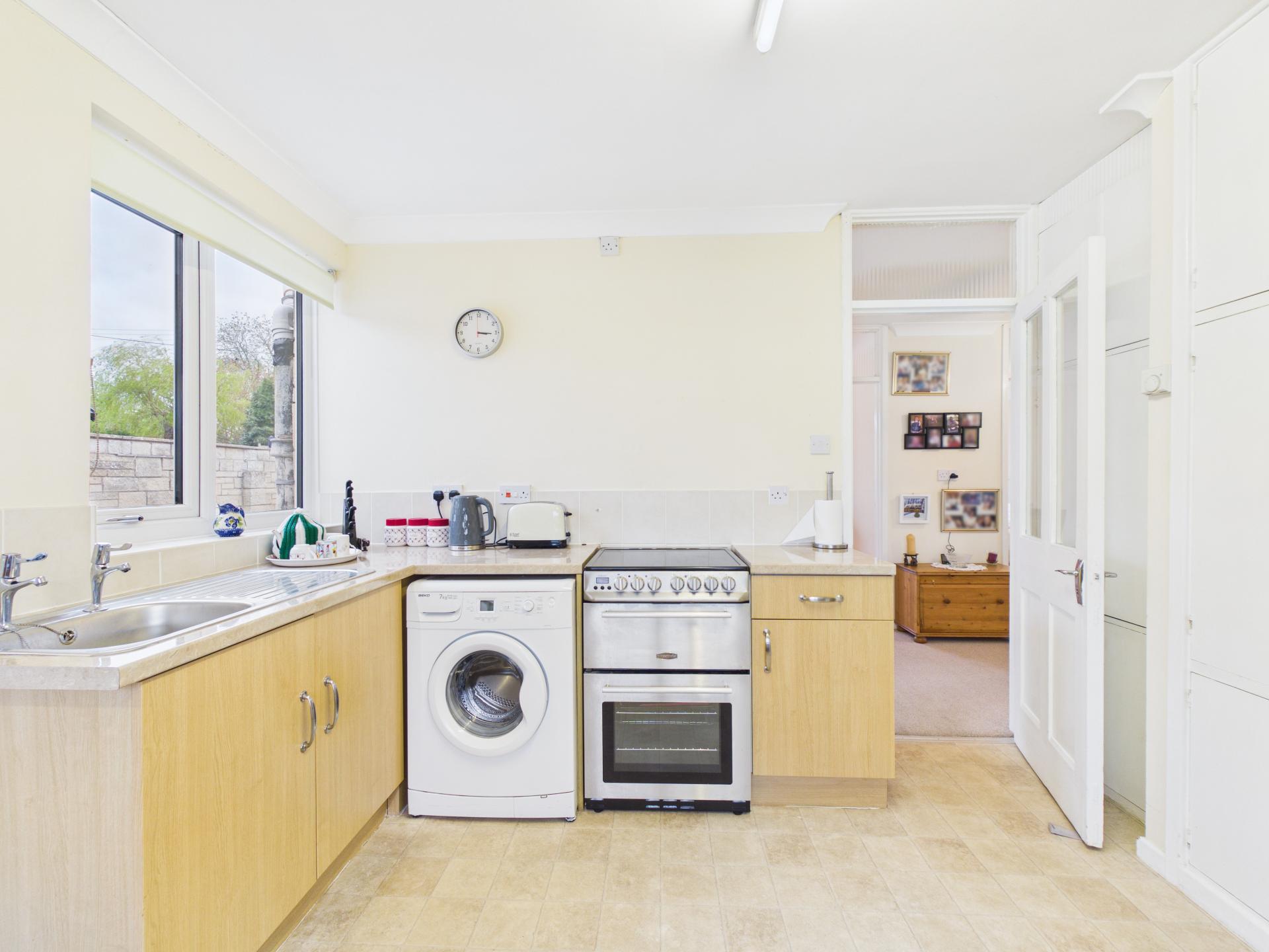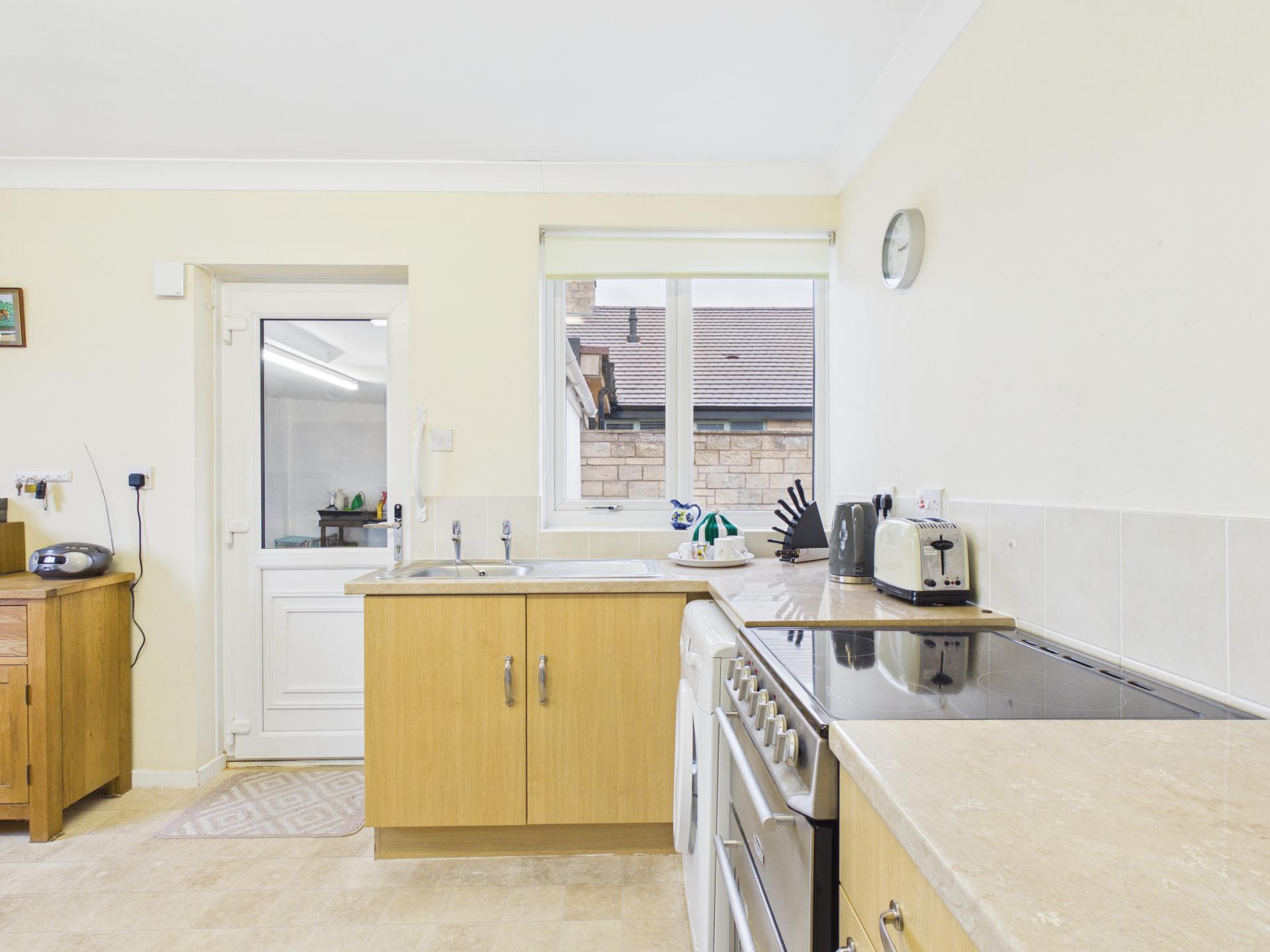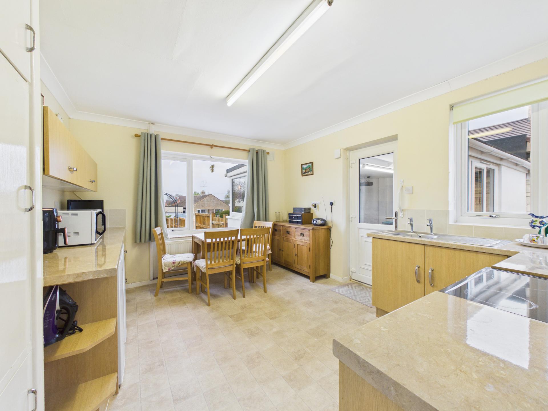 Dual aspect double glazed windows to the front and side aspect. A range of wall and base units surmounted with laminate worktop; stainless steel sink and drainer with mixer taps and tiled splash back. Space and plumbing for a washing machine; oven and fridge/ freezer. Cupboard housing the gas fired boiler. Fluorescent tube light fitting; linoleum flooring; radiator. Door to the hallway and garage.