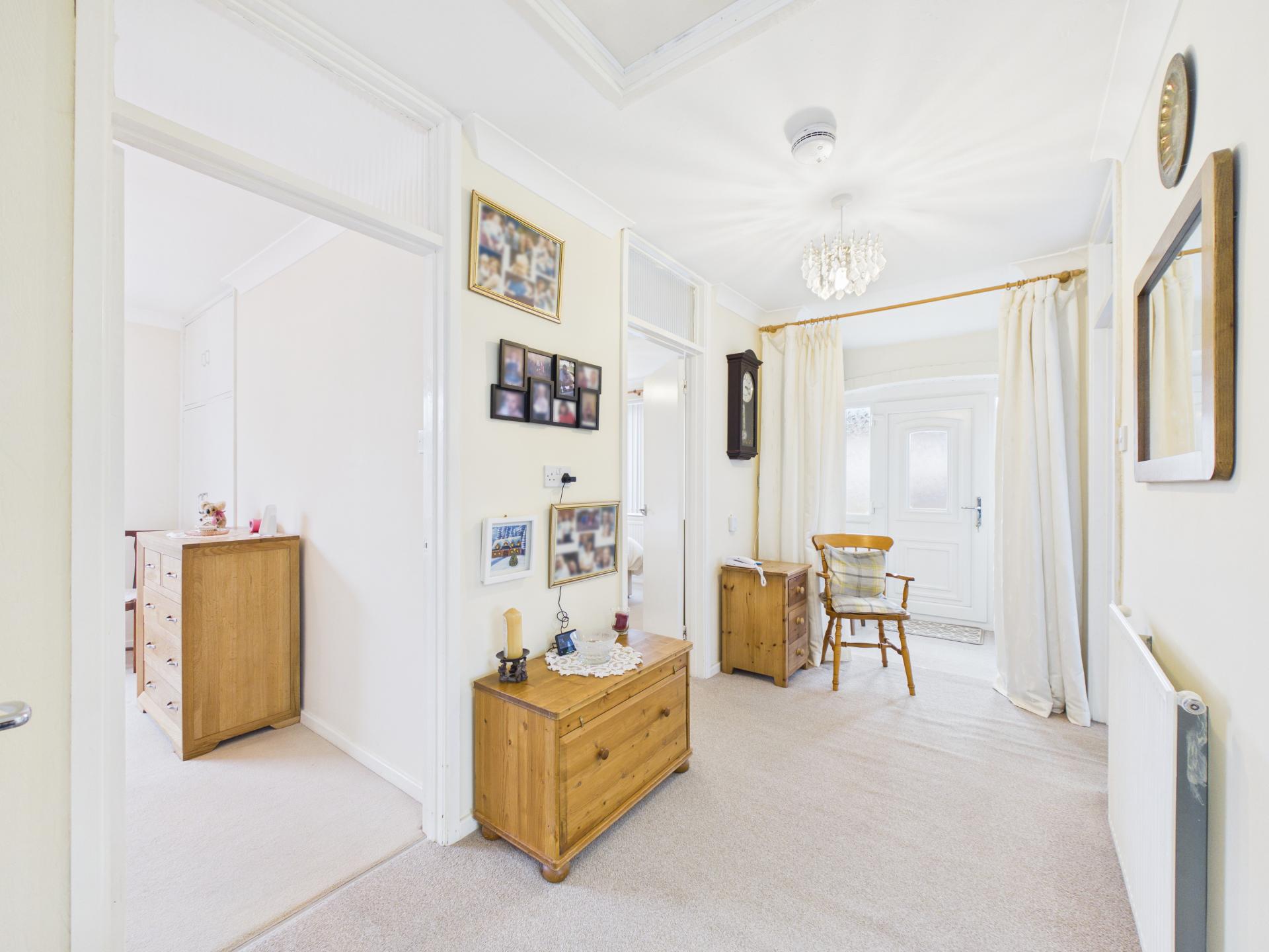 Obscure glazed door leading to the garden. Pendant light fitting; access to the loft. Doors leading to both bedrooms; lounge; kitchen and airing cupboard.