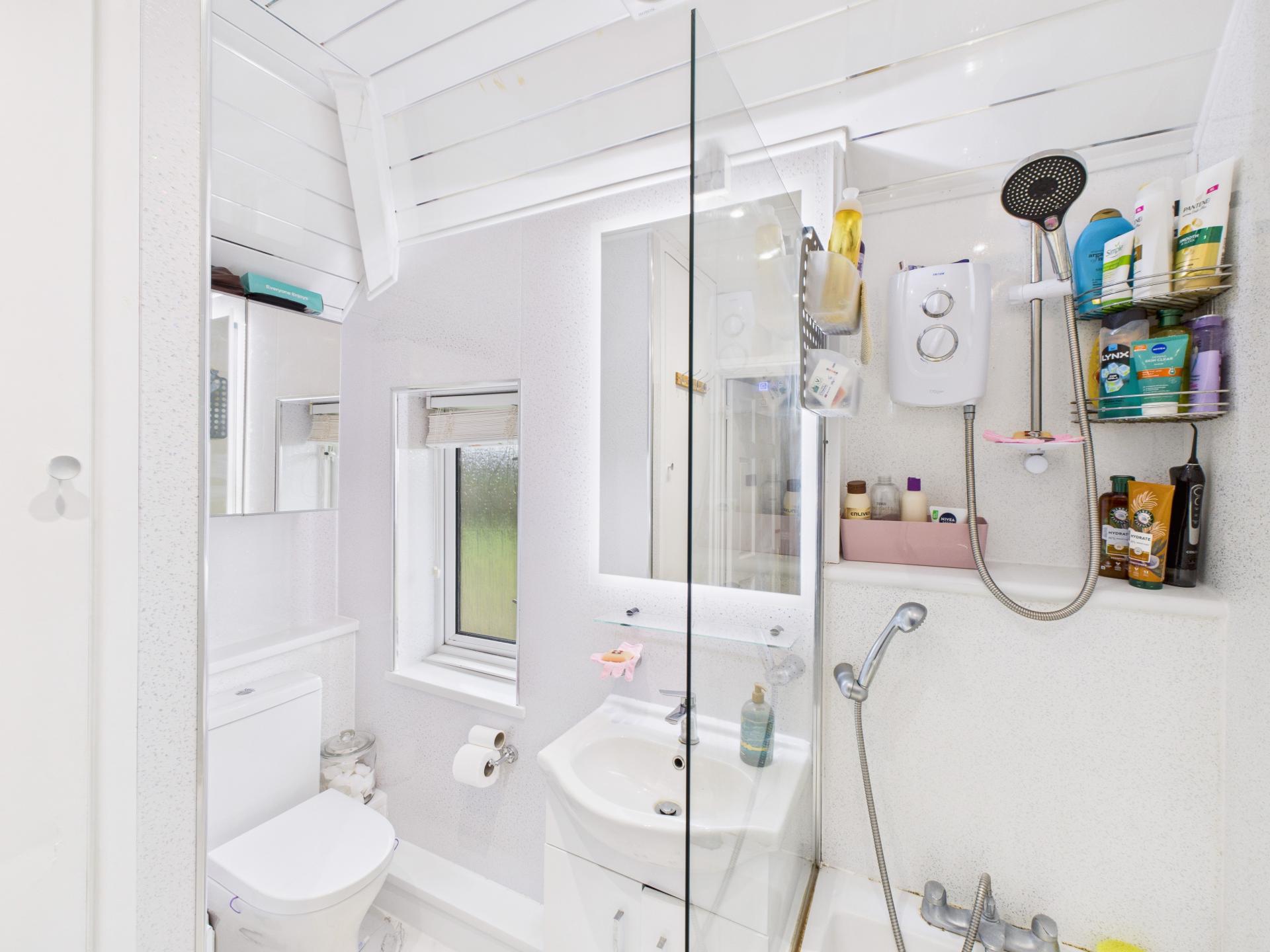 Obscure double glazed window to the front aspect. Panelled bath with mixer tap and hose attachment; over head 'Triton' electric shower with glass screen; vanity hand wash basin with mixer taps and anti-fog LED illuminated mirror above; low level w.c. Ceiling down lights. Extractor fan. Aqua boarded walls and tile effect flooring. Airing cupboard housing the electric immersion boiler.