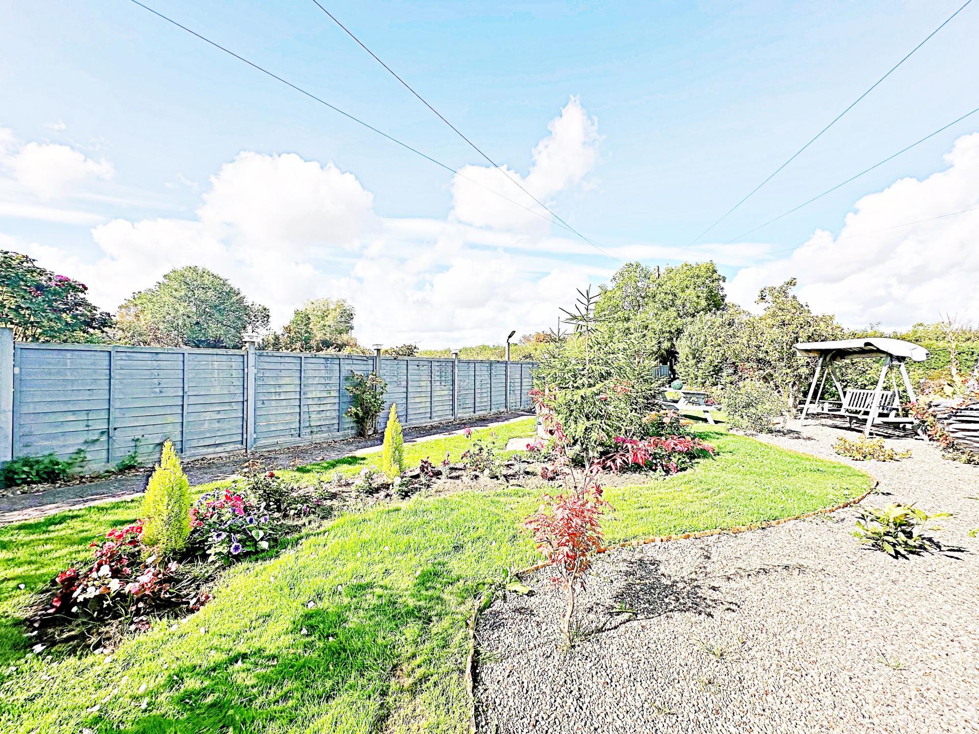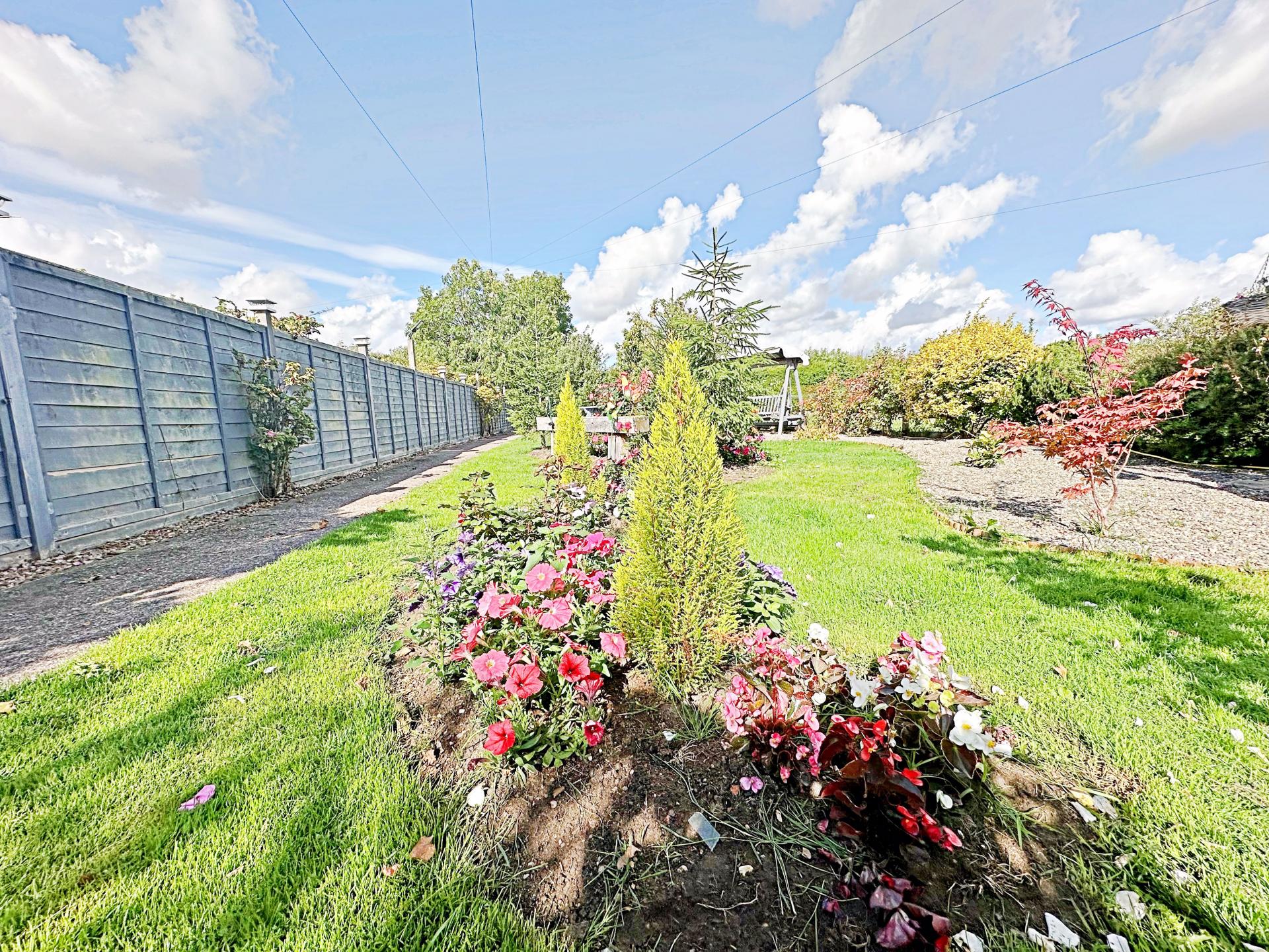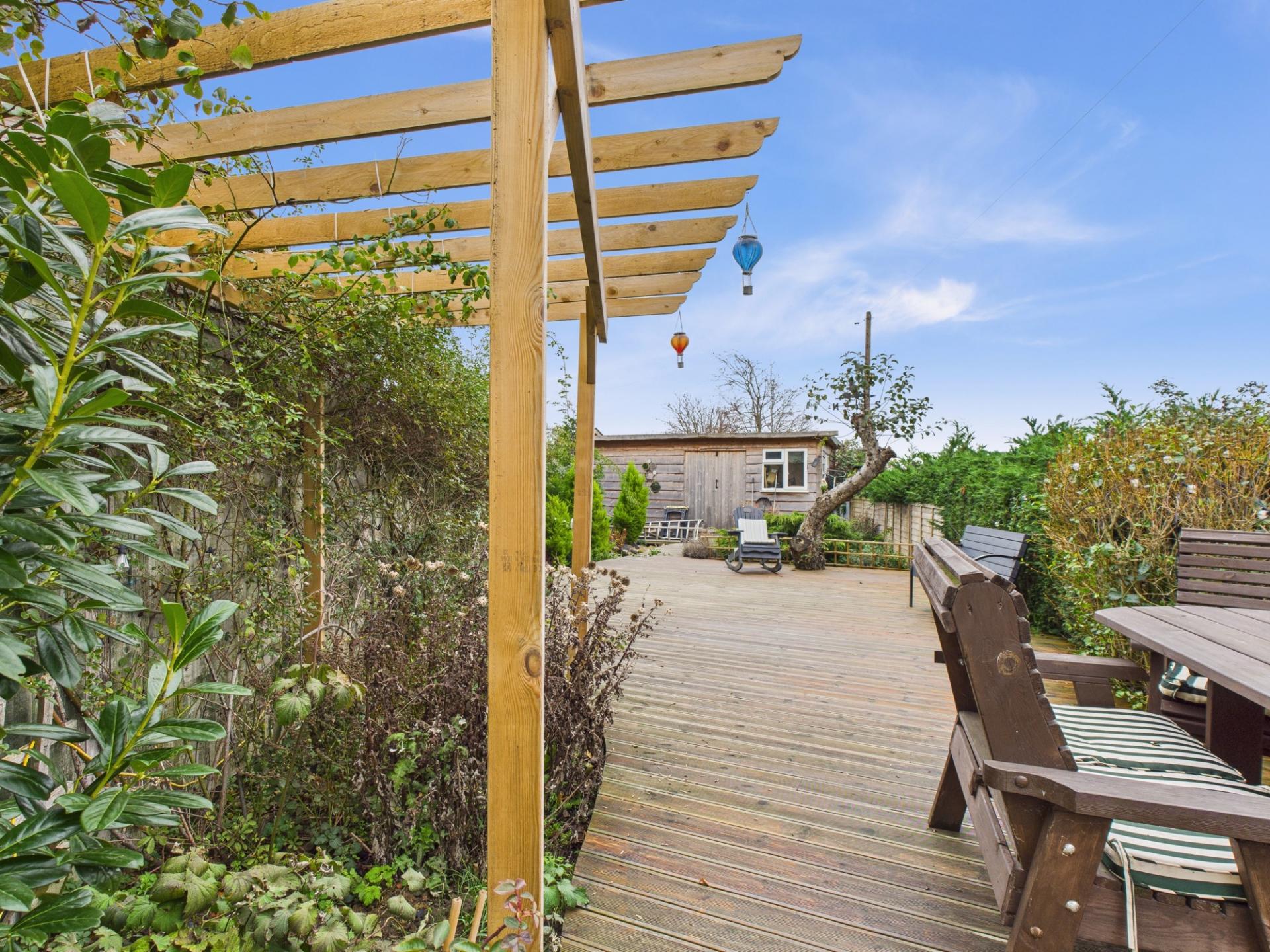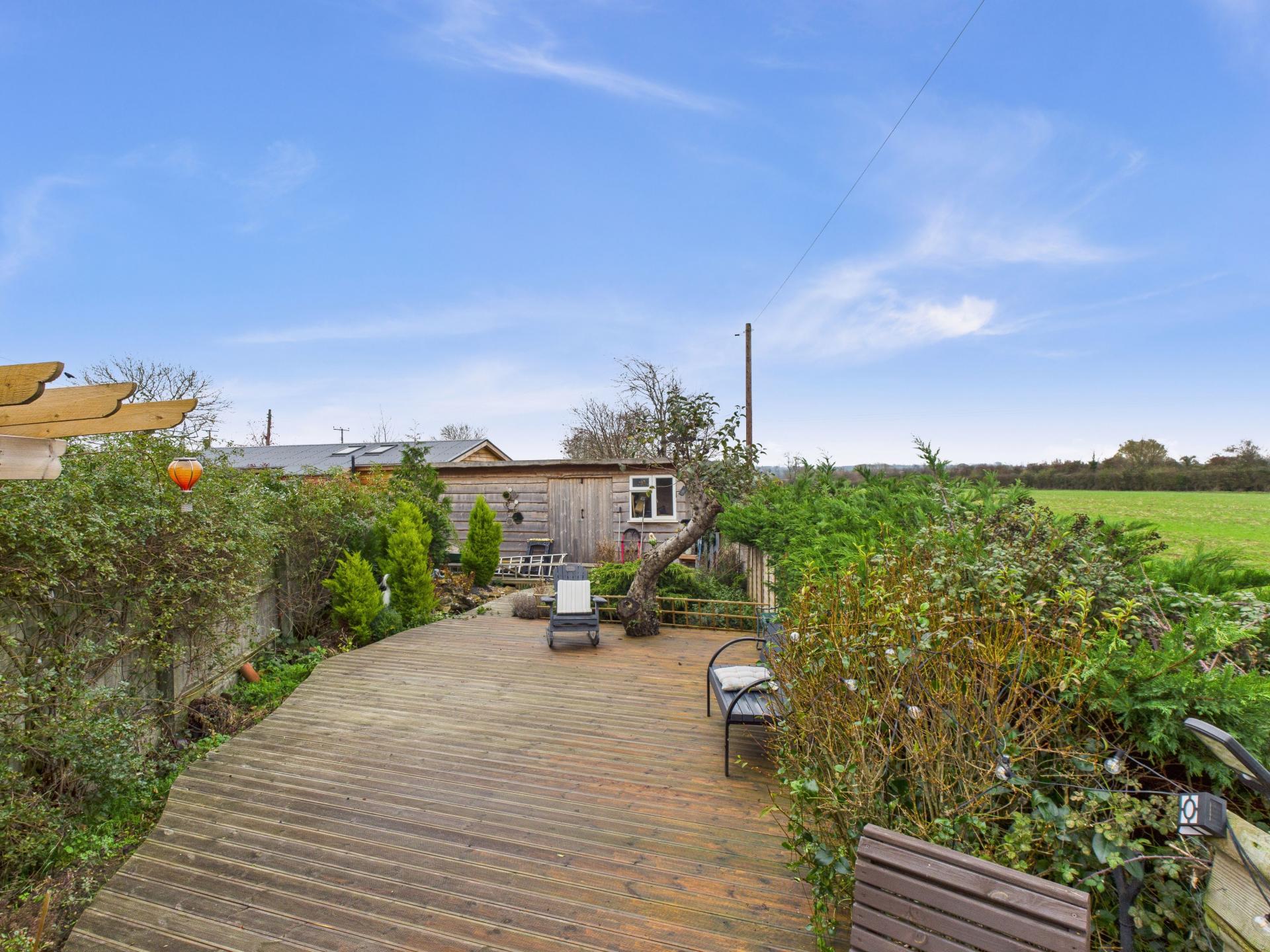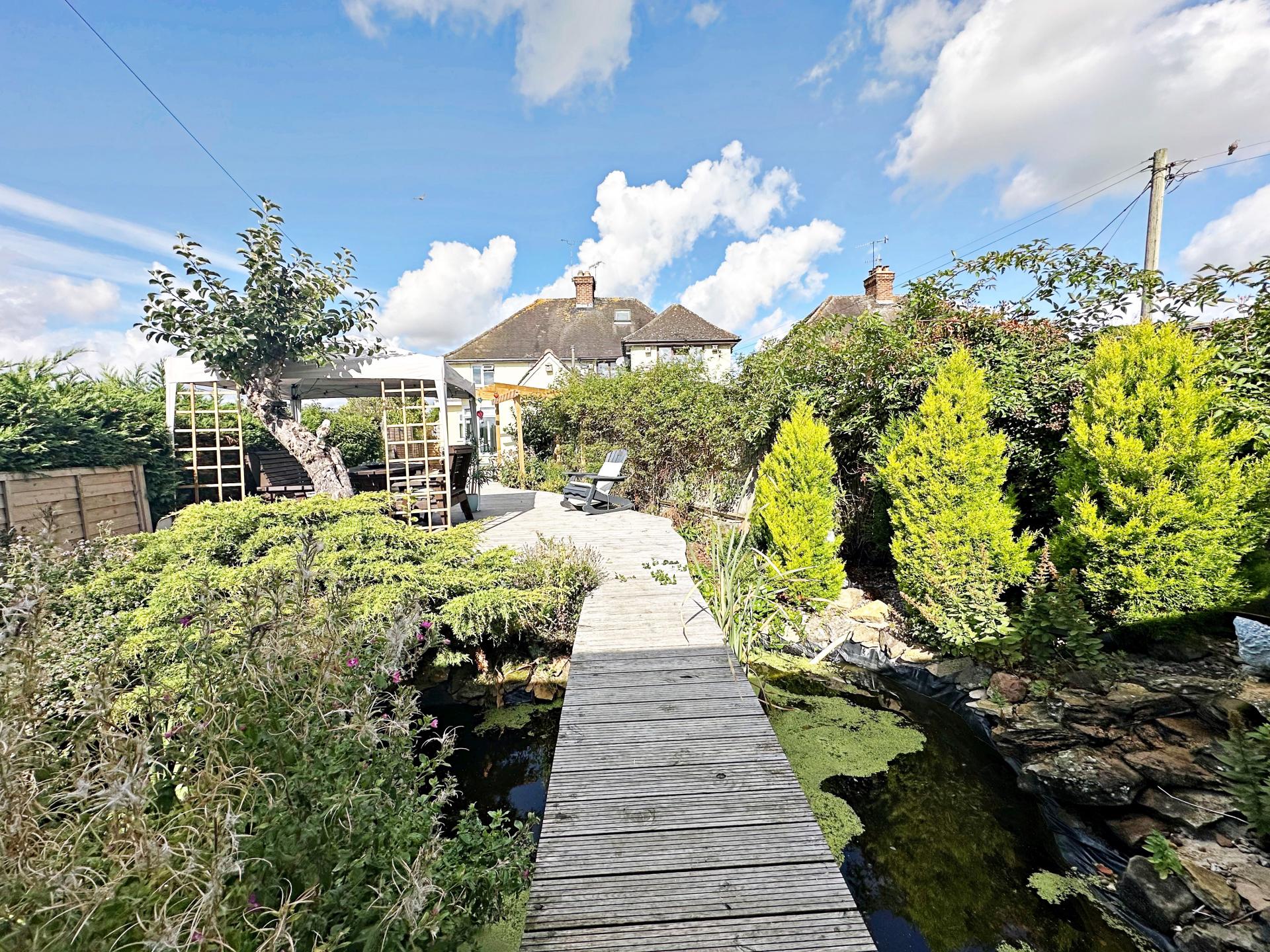 Wooden decking seating area with mature planted borders, including a well established rose bush. Pond with water feature and wooden bridge over to the workshop with light and power (can be used as a home office or summer house). Shed functioning as a bar with light and power. Wooden log store. Gated access to the front.