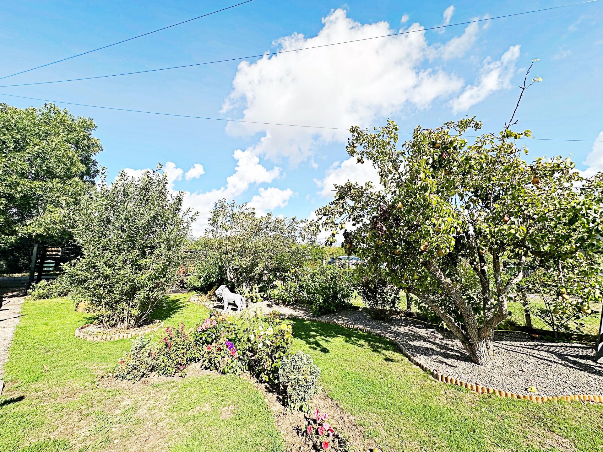 Gated pathway leading through the front garden with a variety of mature planted borders including pear and apple trees. Gravel borders with seating areas. Wooden decking and steps to the front door.