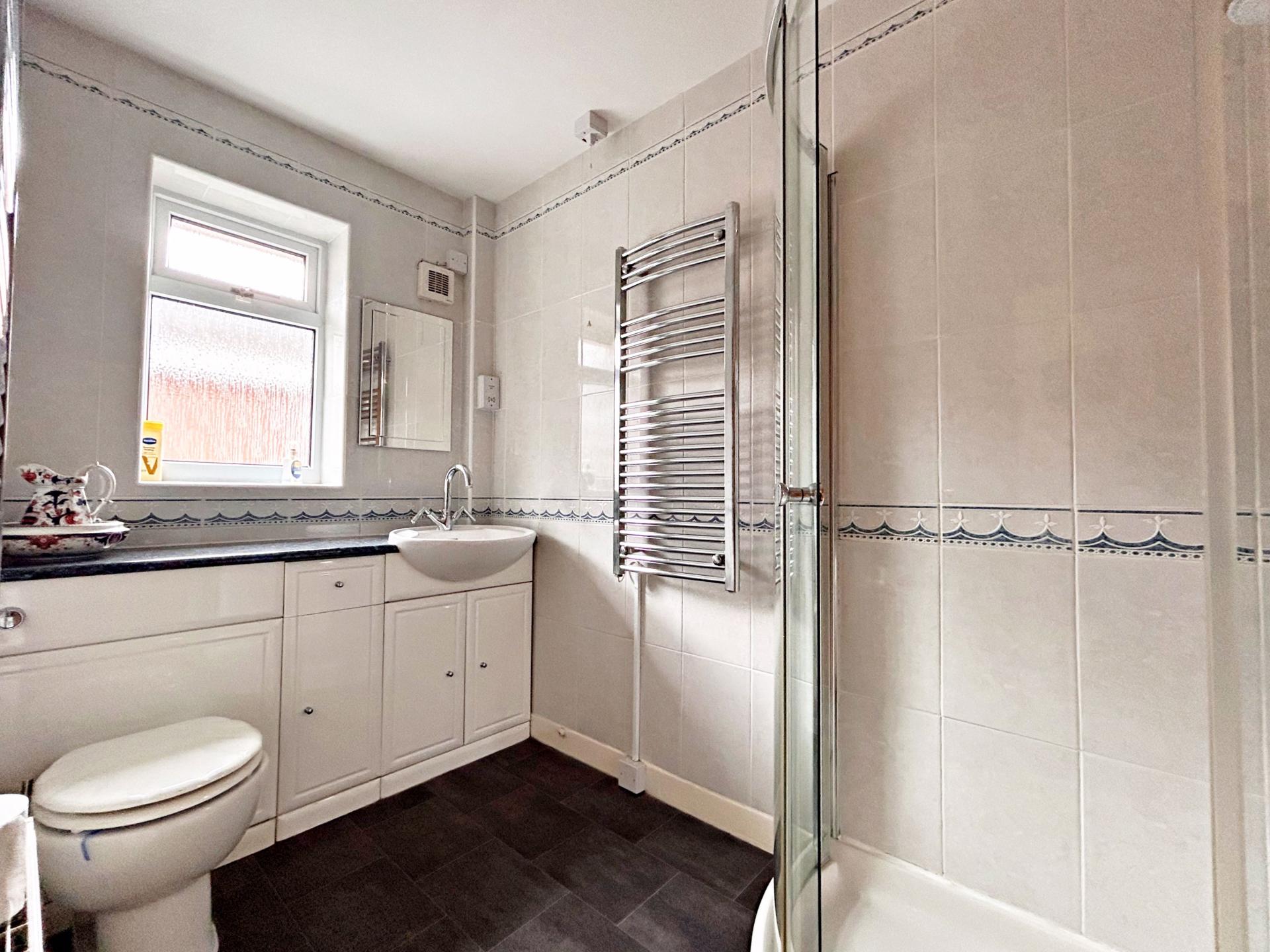 Double glazed window to the side aspect. Shower cubicle with mains fed shower. Vanity wash hand basin and low flush w.c. Tiled splashbacks. Central heated ladder rail and an electric ladder rail. Radiator.