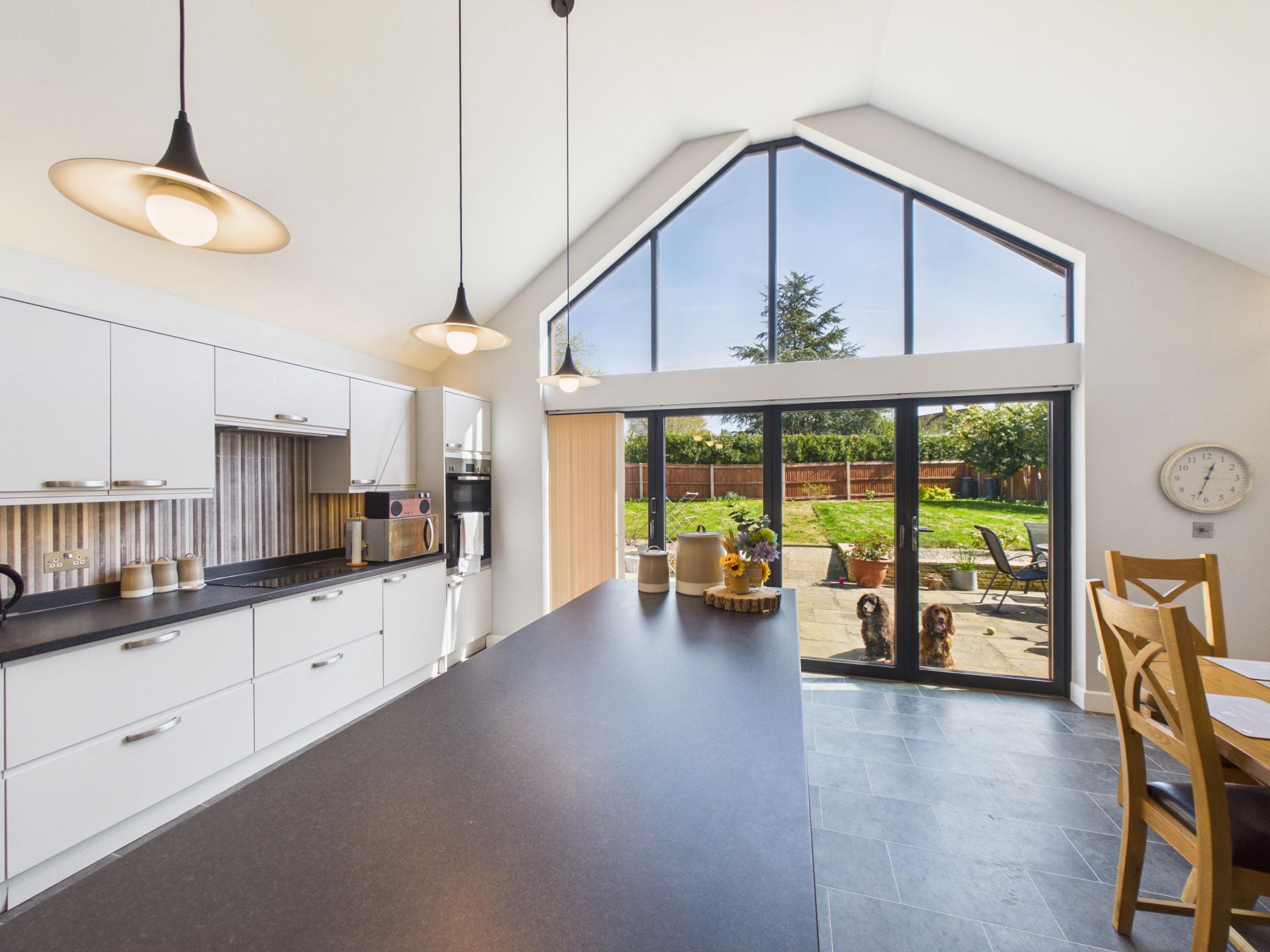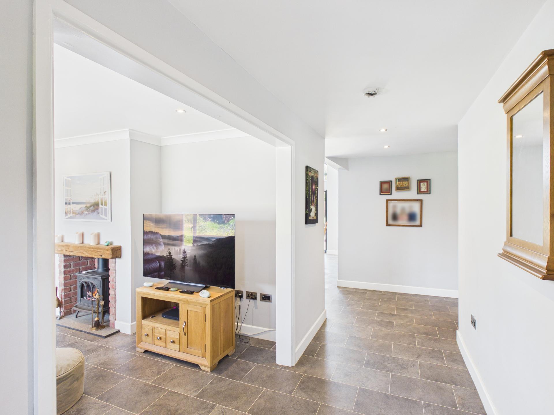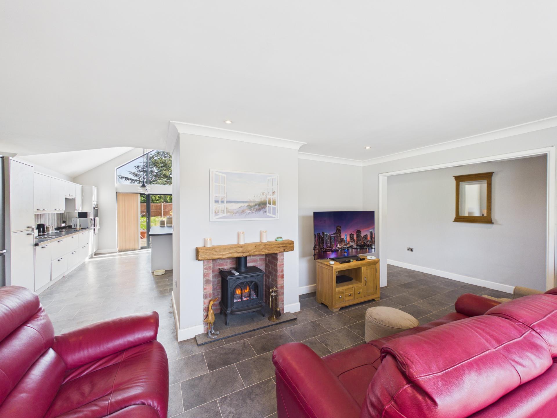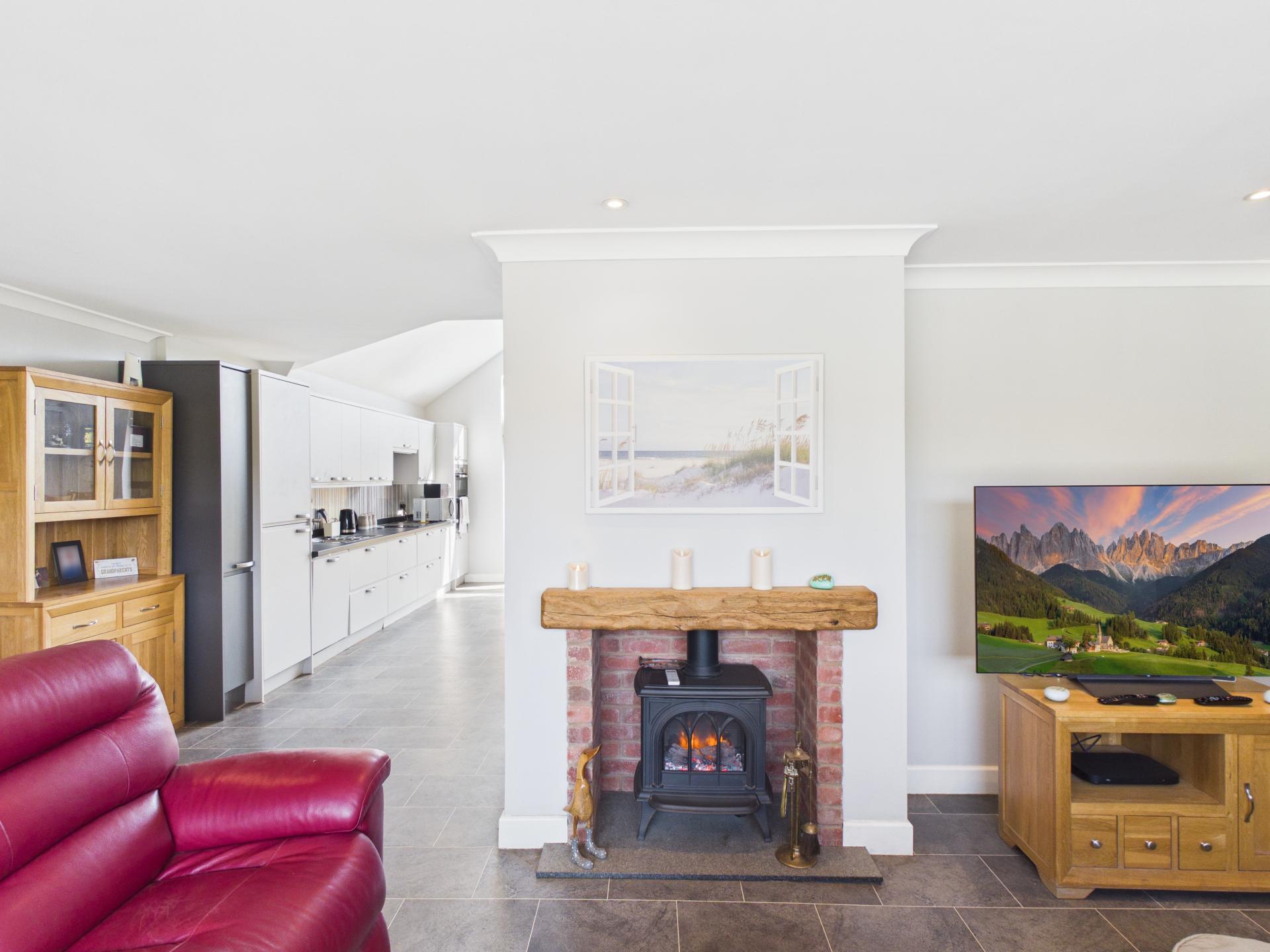 Double glazed gable end window to the rear aspect with bi-folding doors into the garden. Built in LED strip lights and pendant light fitting. Range of wall and base units with laminate worktop and central island; integrated fridge/freezer; integrated 'Beko' dishwasher; 'AEG' induction hob with overhead extractor fan; 'bosch' electric oven and grill. Stainless steel sink and drainer with spring pull down mixer tap; sliding cupboard housing controls for underfloor heating and boiler; tile effect flooring. Open plan into the hallway and lounge.