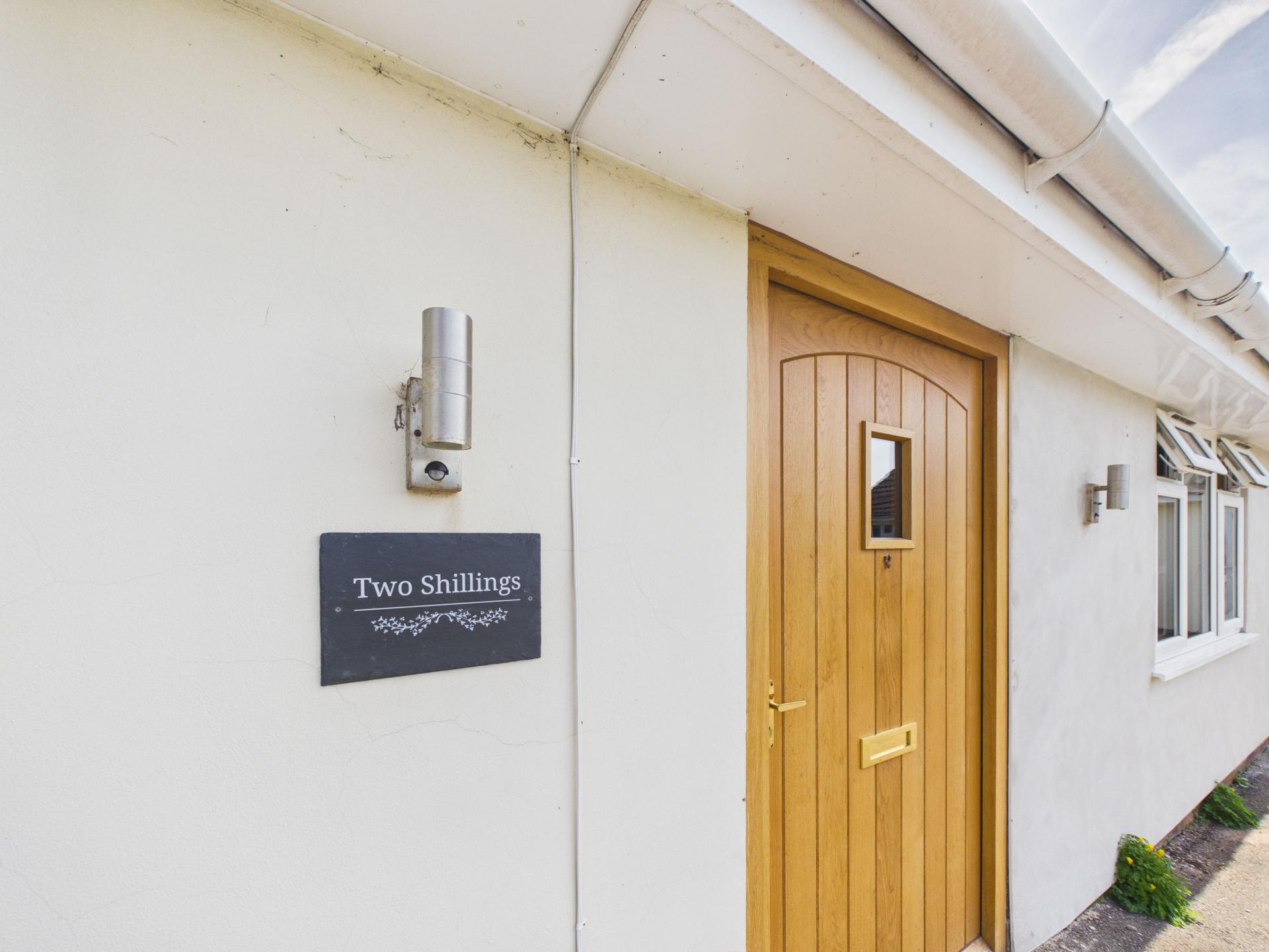 Wall lights; driveway for ample parking. Laid to lawn with mature planting.