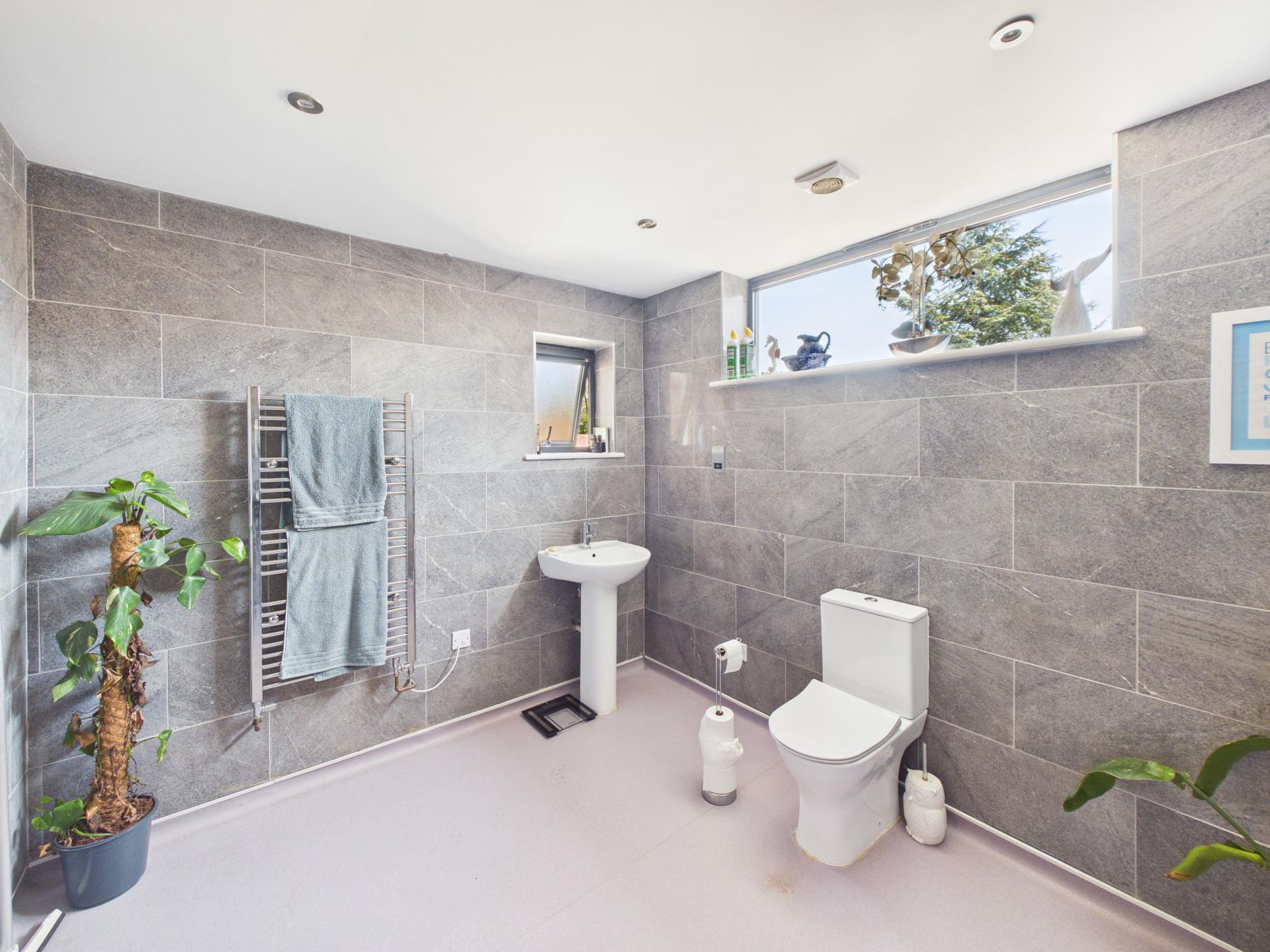 Double glazed window to the rear and obscured glazed window to the side aspect. Hand wash basin with single lever mixer tap; low level w.c.; central heated ladder rail. Mains fed rainfall effect overhead shower; shaver point; extractor; tiled walls. Sliding door to bedroom one.