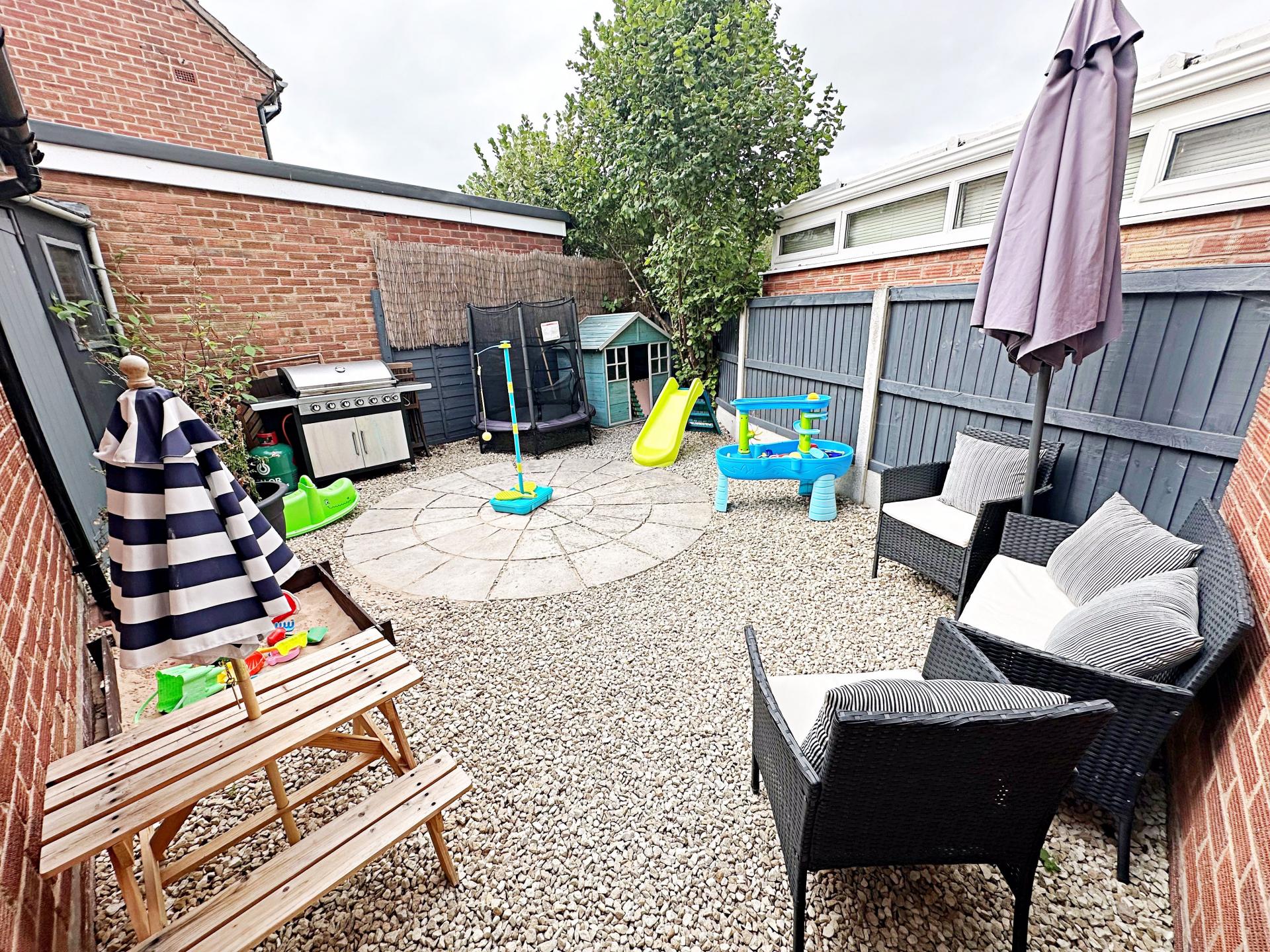 Enclosed with storage shed. Low maintenance with hard landscaping/gravel.
