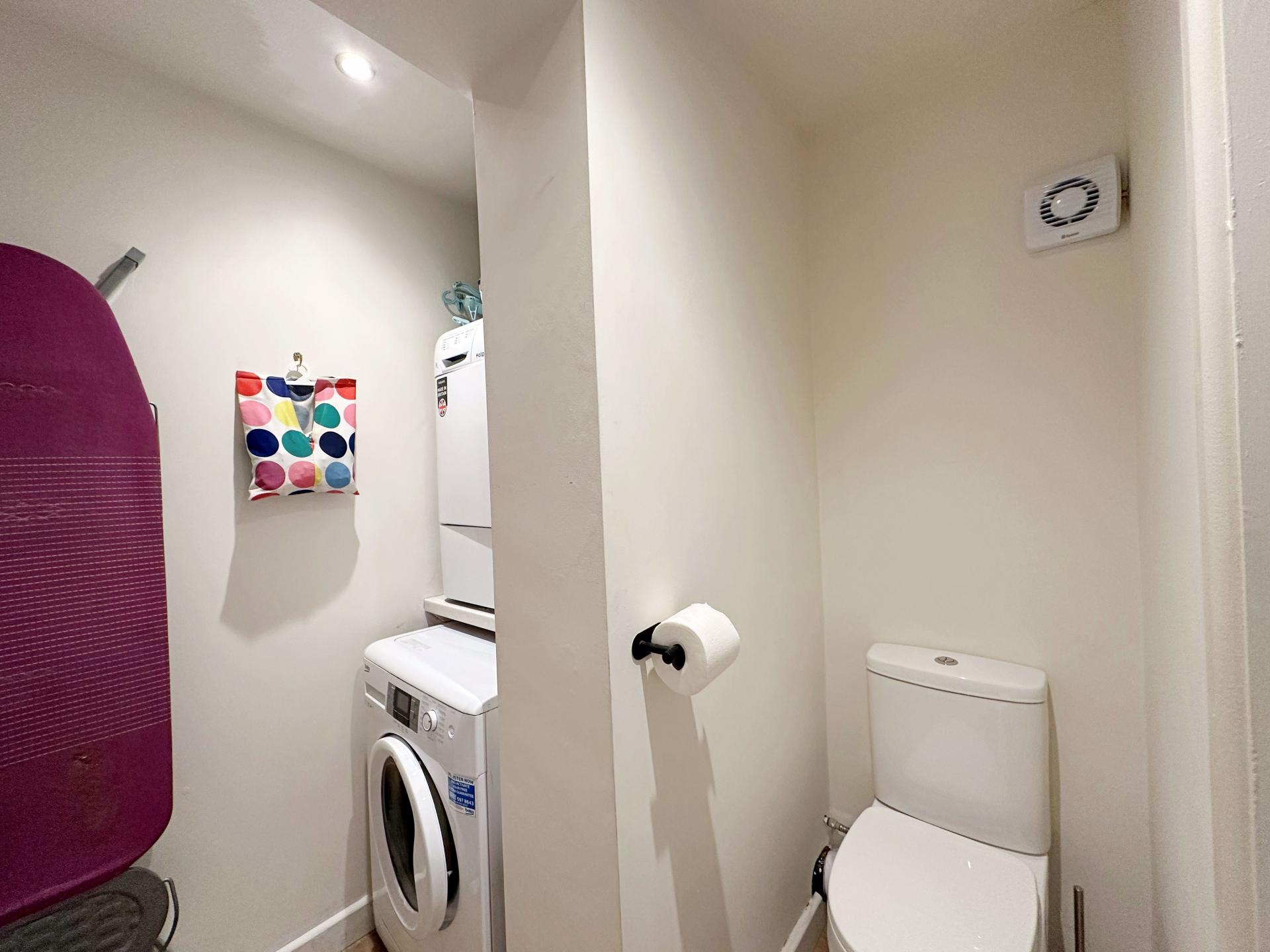 Vanity hand wash basin with mixer tap and tiled splash back; low level w.c. Space and plumbing for a washing machine and tumble dryer. Down lights; extractor fan; wood effect flooring.