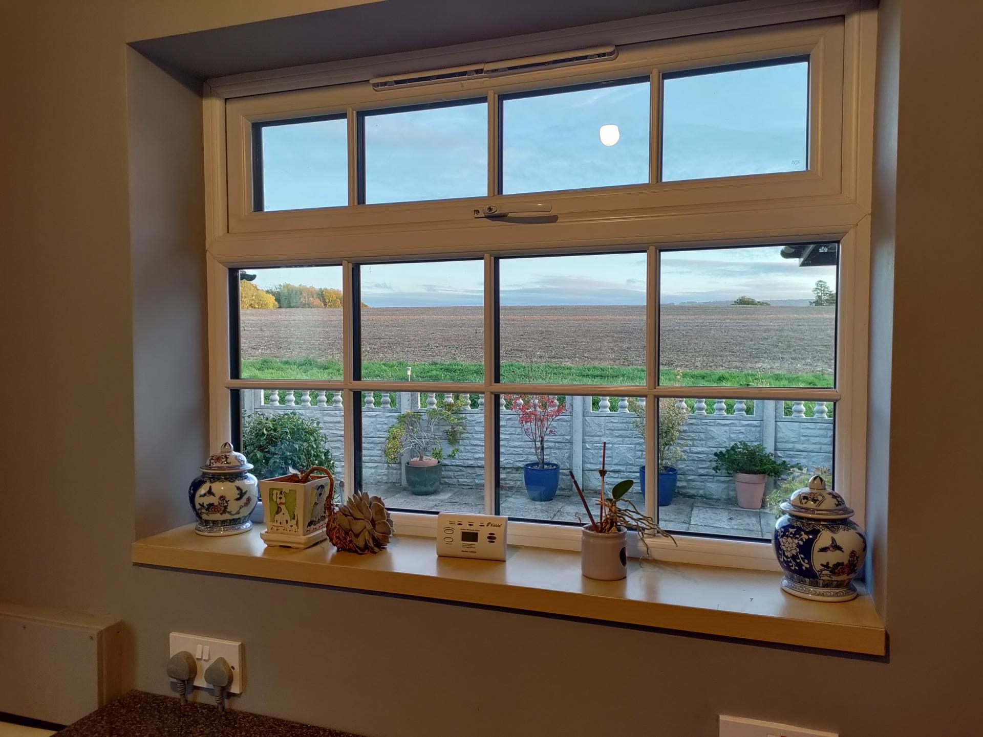 Two double glazed windows to the side aspect with far reaching views. Range of wall and base units surmounted by work surface. Stainless steel sink and drainer with mixer tap. Space for free standing cooker. Space for fridge freezer. Radiator. Coving to the ceiling. Tiled effect flooring.