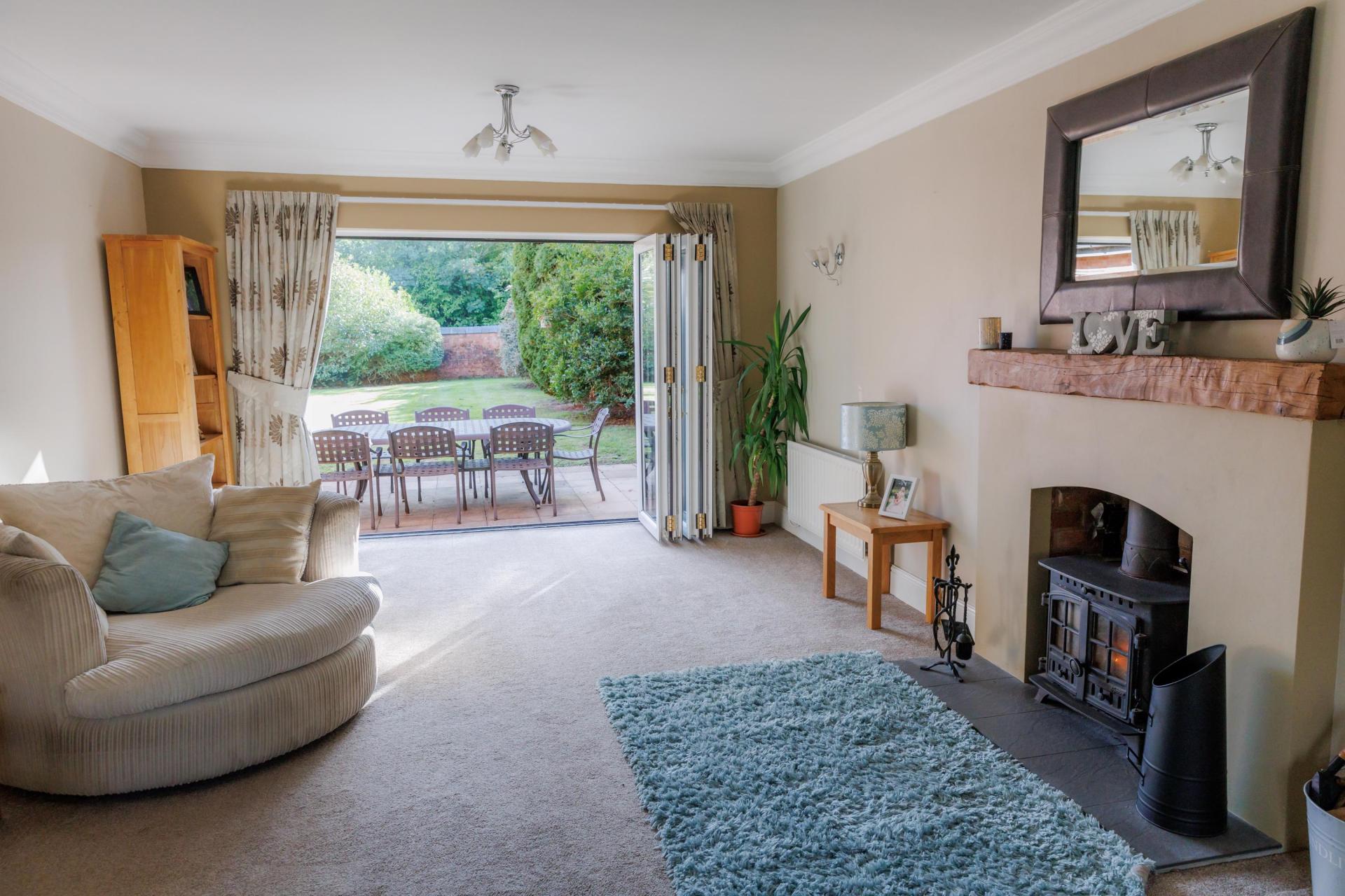 Double glazed bay window to the front aspect. Double glazed bi-fold doors to the rear garden. Inset wood burning stove with oak mantle and slate hearth. Pendant light fitting; radiators.