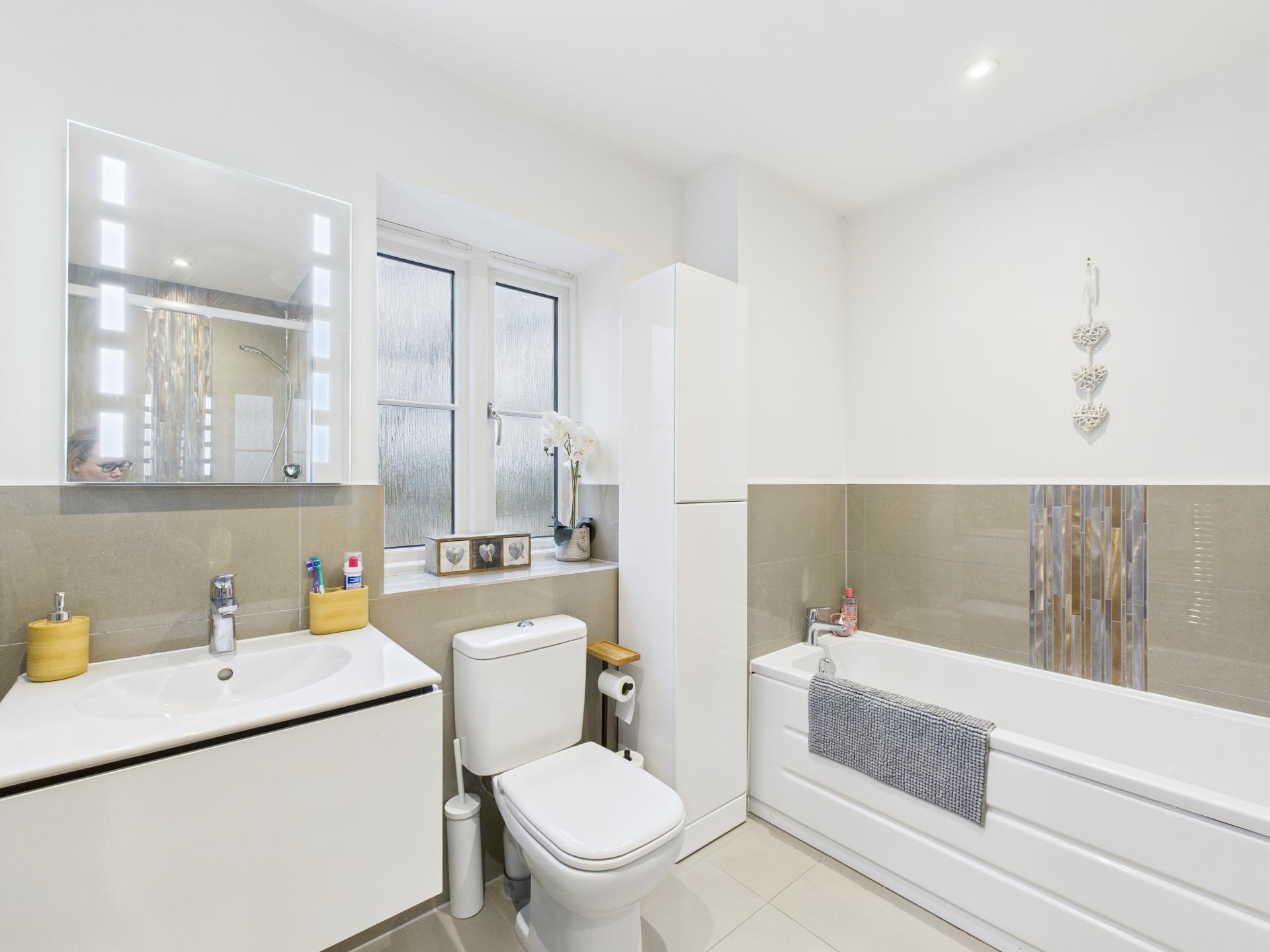 Obscure double glazed window to the side aspect. Panelled bath with mixer tap; mains fed mixer shower cubicle with glass screen and door; vanity hand wash basin with mixer tap; low level w.c.; central heated ladder rail; down lights; extractor; part tiled walls; tiled flooring.