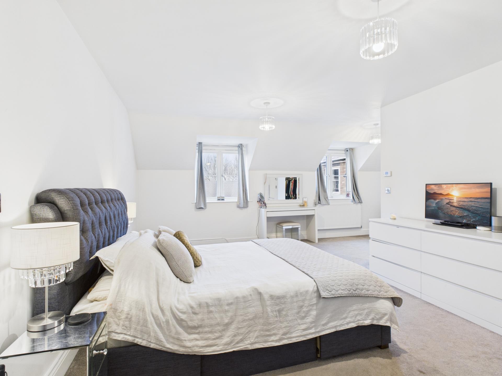 Double glazed windows to the front aspect. Built in storage cupboard with hanging rail; open to the dressing area which has shelving and hanging rail. Pendent light fitting. Radiators. Door into the en-suite.