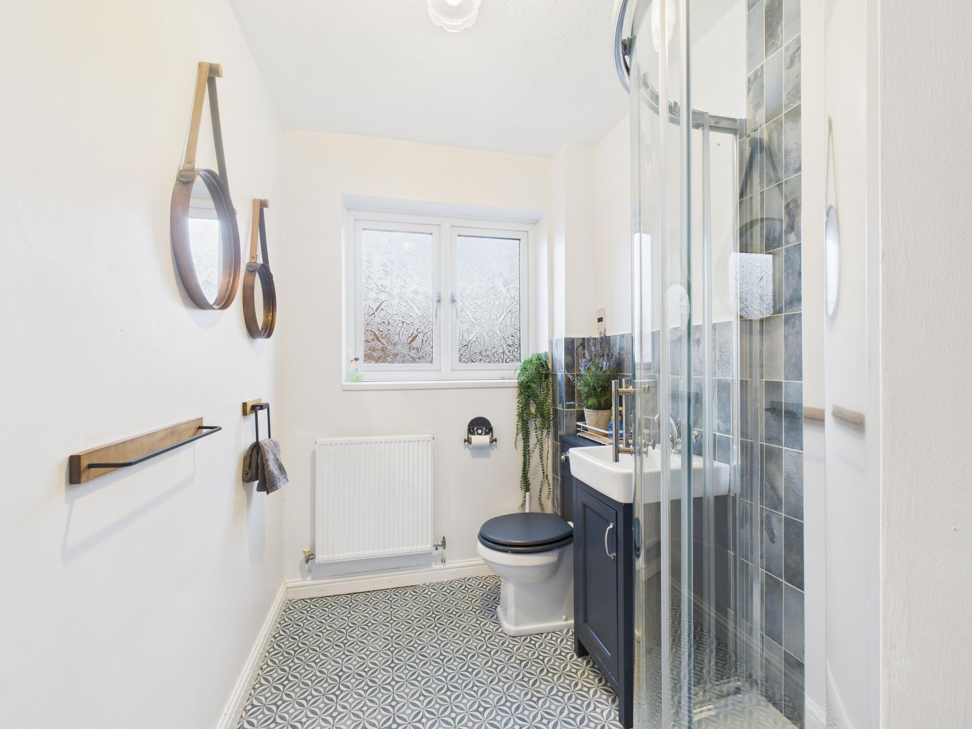 Obscured double glazed window to the front aspect. Shower cubicle with mains fed shower; raindrop shower head and glass doors. Vanity unit with wash hand basin and low flush w.c. Shaver point. Part tiled walls; pendant light fitting; radiator.