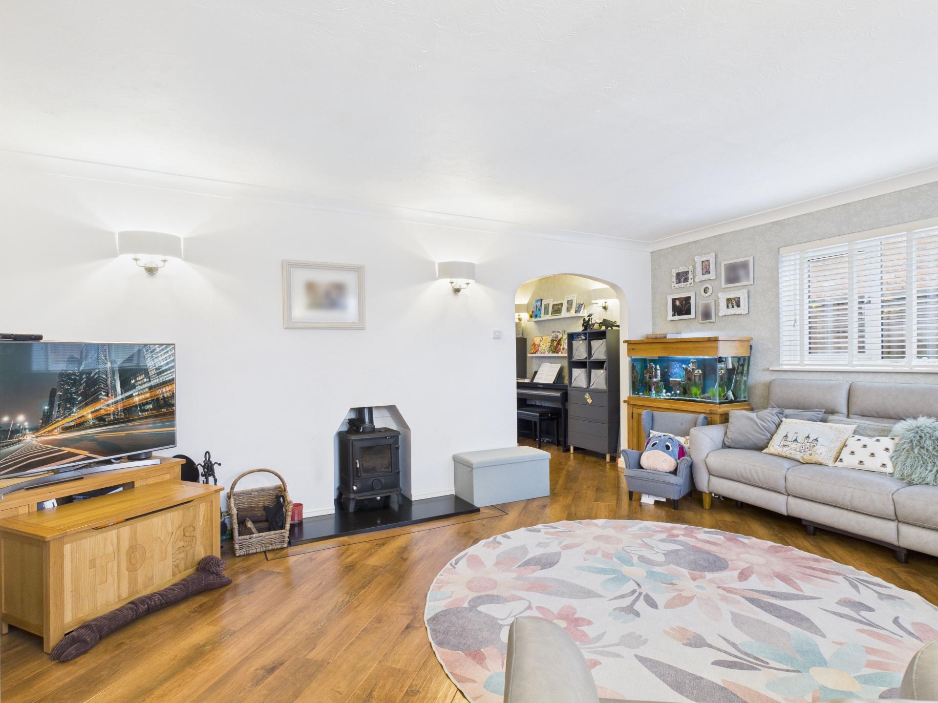 Double glazed dual aspect windows. Multi fuel burning stove with granite hearth. Wall lights; Karndean flooring; radiator. Archway to the dining room/play room.