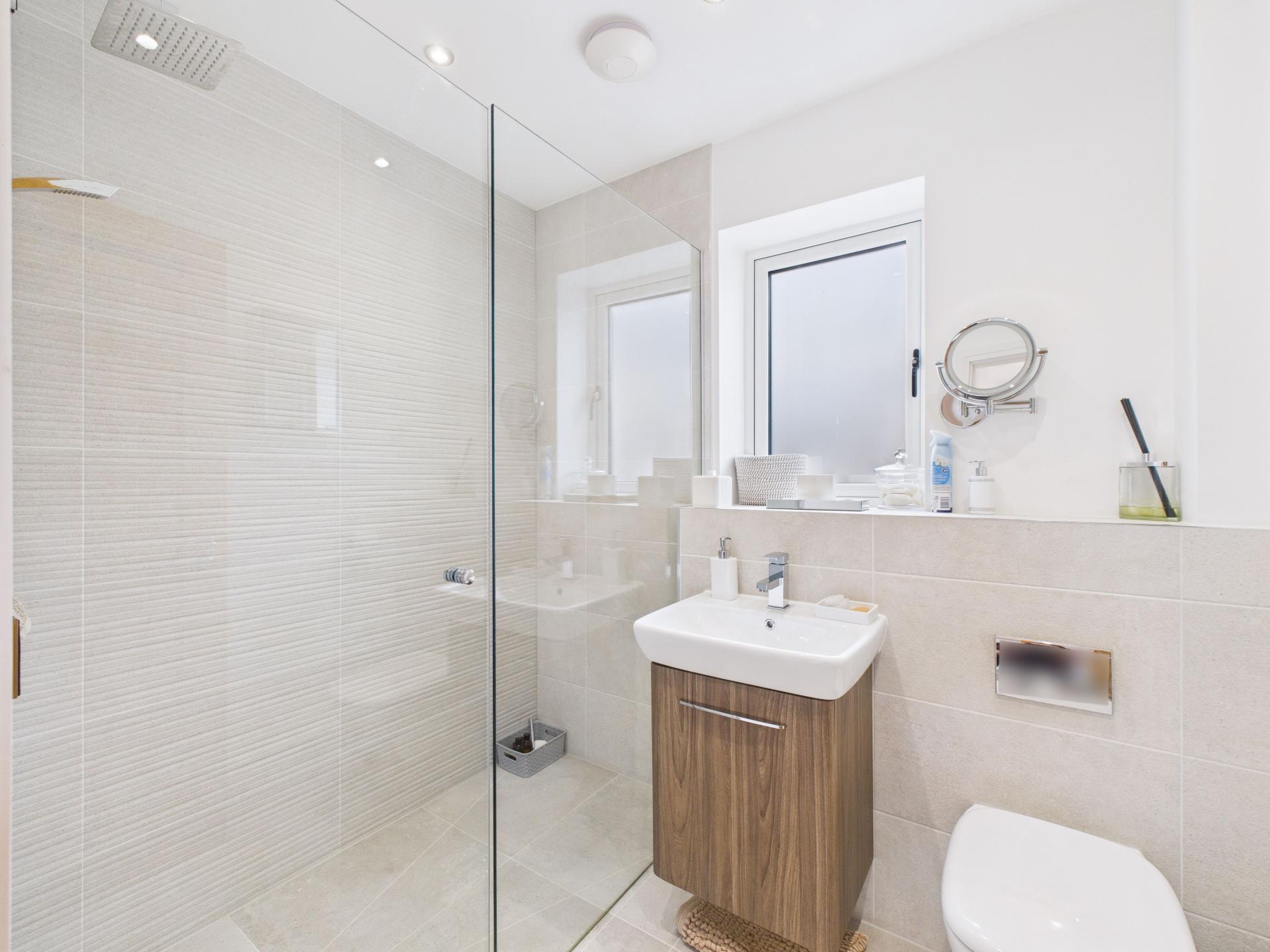 Obscure double glazed window to the side aspect. Large walk in shower cubicle with rainfall shower head and hose attachment, glass screen and door. Vanity hand wash basin with mirror and shaver point above. Low level w.c. Ceiling down lights and extractor fan. Heated towel rail. Tiled flooring and part tiled walls.