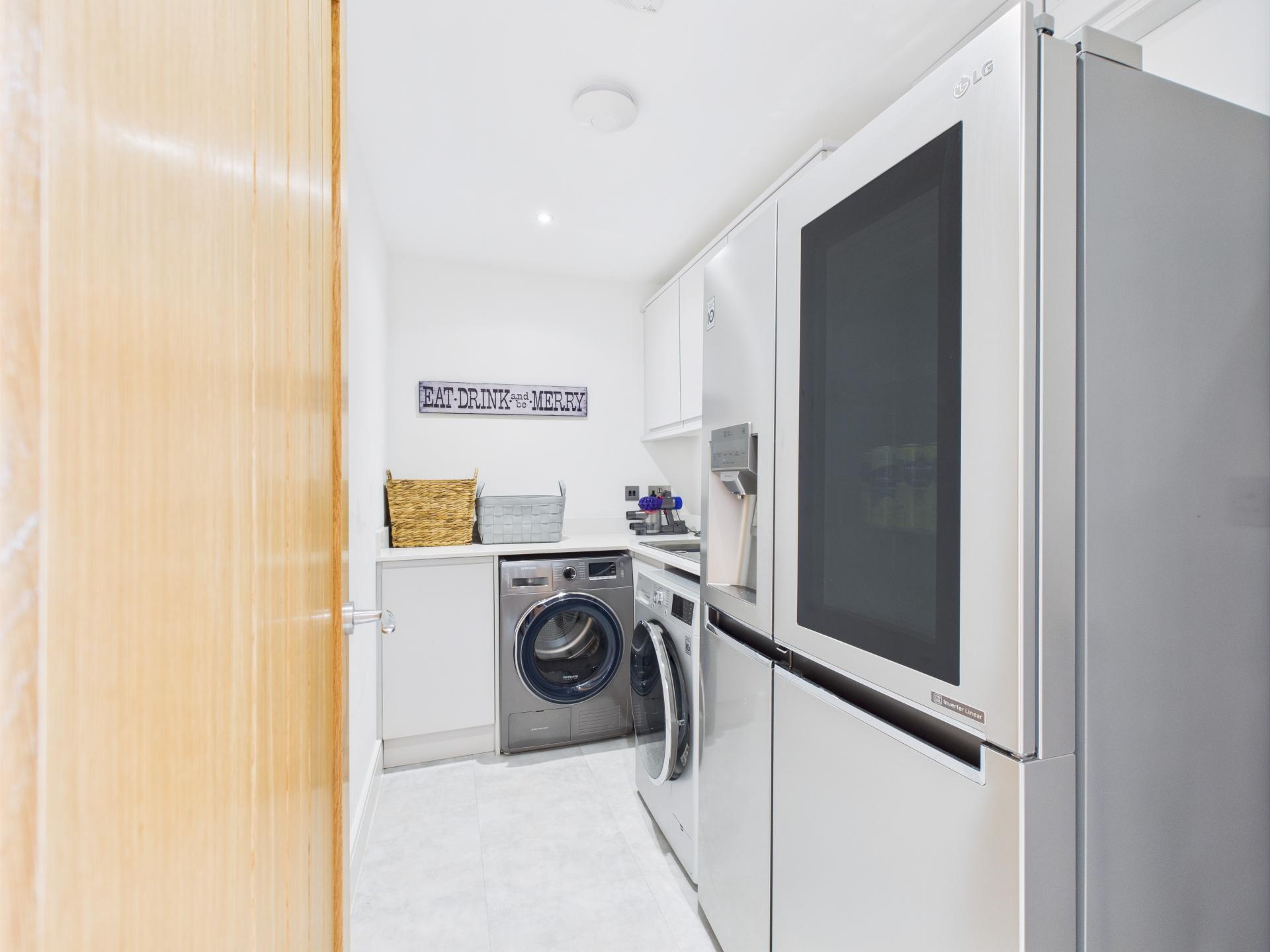 Fitted with a range of wall and base units surmounted by work surface. Stainless steel sink and drainer with mixer tap. Space and plumbing for a washing machine and tumble dryer. Space for an American style fridge freezer. Ceiling down lights and extractor fan. Luxury vinyl tiled flooring. Door into the kitchen dining/ family room.